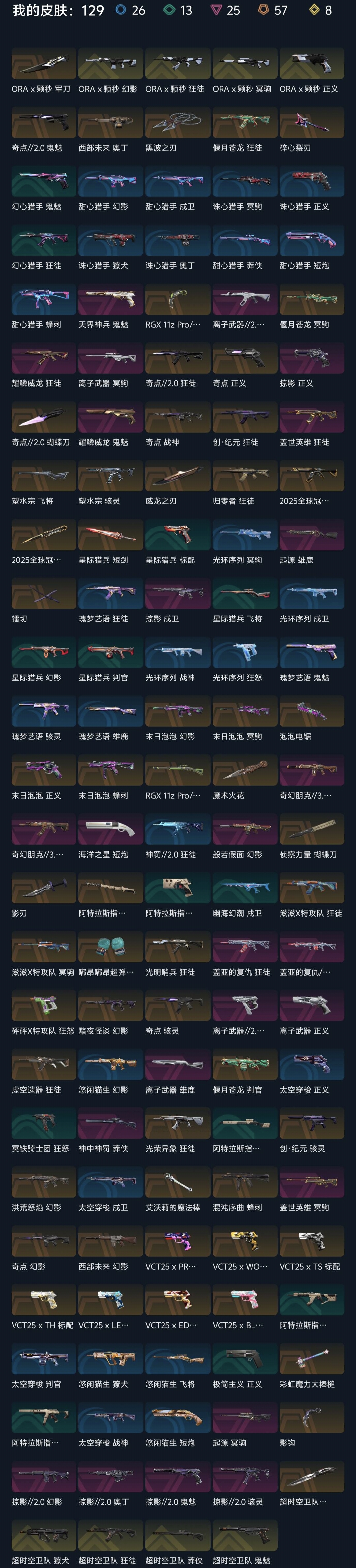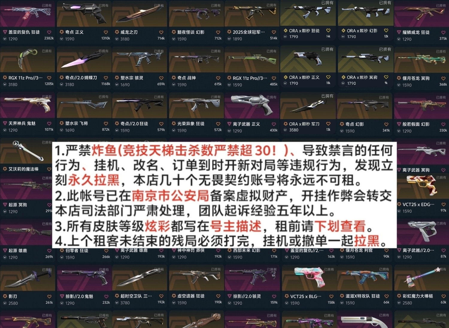 对局结束时间超过订单结束时间10分钟以上永久拉黑,上个租客的残局不打直接撤单永久拉黑! 账号无冻结随意发起号主协助必拉黑! 骂人挂机零容忍,发现永久拉黑,永不恢复。 秒解冻,首次登录失败后请在平台发起号主协助并立即尝试第二遍登录。(敏感操作容易导致账号突然冻结) 此号已使用源晶点数(R点):3265R 现在挂机会直接禁赛7天!请及时续租不要挂机,如果到时不下线,下一个租客会挤号导致挂机,所以请及时续租,导致禁赛的一律永久拉黑。 炸鱼会封三天机械码,会导致你的设备在三天内玩不了无畏契约,下三段请控制击杀数不要超30个(黄金、铂金杀太猛也有概率封机械码),导致禁赛永久拉黑。 如遇授权异常下架请及时维权撤单,等待两分钟后会重新上架。 禁止挂机逃跑!禁止骂人!到时后严禁再开游戏,发现永久拉黑。请合理控制炸鱼力度,不然会被别人举报禁赛,你自己的电脑也会被封机械码几天玩不了瓦,被禁赛累计3次的租客会被我永久拉黑。请合理控制租号时长,以免被后续租客顶号。此帐号已在南京市公安局备案,封号时长超过30天会联系警方严肃处理!封号一个月赔偿金额2500元起步,封号三个月赔偿金额7740元起步。 骂人si全家,发现永久拉黑,你跪着求我也不会给你解开,本店24h全程检查违规行为。被拉黑者将无法游玩本店的所有高性价比账号。如果被禁言请和好友通过其它软件语音聊天。 请不要使用拓展坞和yun电脑进行游戏,会被禁赛和封机械码。 喜欢的可以收藏,此号后续会持续氪金。有任何问题可以通过掌瓦留言咨询。 遇到无法登录等问题及时去号主通道加急处理 恶意退排位恶意无理由撤单一律黑名单【店铺所有账号均于南京市网监局备案虚拟财产,开挂/鼠标宏/恶意卡BUG等毁号行为,直接联合本平台提供详细信息邮寄律师函!必追责原价赔偿! 狂徒:ORA颗秒狂徒满级/2025全球冠军赛狂徒满级(25冠军狂徒)/滋滋X特攻队4级全炫彩/盖亚的复仇狂徒4级全炫彩(盖亚狂徒)/光荣异象狂徒4级全炫彩/虚空遗器狂徒4级全炫彩(虚无狂徒)/创纪元狂徒4级粉色/光明哨兵狂徒4级全炫彩/盖世英雄狂徒4级幽月/超时空卫队狂徒4级全炫彩/离子武器狂徒4级/奇点狂徒4级蓝色/奇幻朋克狂徒4级/神罚狂徒 近战武器:ORA颗秒军刀满级/显卡爪刀2级全炫彩/2025全球冠军赛蝴蝶刀满级/镭切2级粉色红色/黑波之刃2级白色/泡泡电锯2级黄色/魔术火花2级全炫彩(电工钳)/奇点蝴蝶刀2级蓝色/艾沃莉的魔法棒2级粉红/侦察力量蝴蝶刀2级红色/影钩2级全炫彩(掠夺爪刀)/影刃2级/彩虹魔力大棒槌2级/超时空卫队三棱军刺2级全炫彩/嘟昂嘟昂超弹力水球拳套2级全炫彩 幻影:ORA颗秒幻影满级/末日泡泡幻影4级黄色红色/黯夜怪谈幻影4级黑色蓝色(古神幻影)/洪荒怒焰幻影4级钴蓝(流脓幻影)/奇点幻影4级紫色/般若假面幻影4级飞燕落花(恶鬼幻影)/西部未来幻影4级金色银色/掠影幻影4级红色白色(掠夺幻影) 鬼魅:天界神兵鬼魅4级/奇点鬼魅4级/掠影鬼魅4级白色(掠夺鬼魅)/超时空卫队鬼魅4级全炫彩 正义:ORA颗秒正义满级/奇点正义4级紫色/末日泡泡正义4级黄色/离子武器正义4级(离子正义)/掠影正义4级白色/极简主义正义 标配:VCT25xBLG标配满级/VCT25xEDG标配满级/VCT25xTS标配满级/VCT25xTH标配满级/VCT25xLEV标配满级/VCT25xPRX标配满级/VCT25xWOL标配 戍卫:掠影戍卫4级白色(掠夺戍卫) 冥驹:ORA颗秒冥驹满级/偃月苍龙冥驹4级莹白/末日泡泡冥驹4级黄色/滋滋X特攻队冥驹4级全炫彩/起源冥驹4级白色/盖世英雄冥驹 獠犬:超时空卫队獠犬4级蓝色 莽侠:rgx11zpro莽侠满级蓝色(显卡莽侠)/超时空卫队莽侠4级金色 骇灵:创纪元骇灵4级粉色(exo骇灵)/掠影骇灵4级红色(掠夺骇灵) 判官:偃月苍龙判官4级萤白(玉龙判官) 蜂刺:末日泡泡蜂刺4级黄色/混沌序曲蜂刺4级白色蓝色(混沌蜂刺) 雄鹿:离子武器雄鹿4级(离子雄鹿)/起源雄鹿 飞将:塑水宗飞将4级白色 奥丁:掠影奥丁4级红色白色(掠夺奥丁) 战神:奇点战神4级紫色/盖亚的复仇战神4级蓝色(盖亚战神) 狂怒:砰砰X特攻队狂怒4级黄色(玩具狂怒)/离子武器狂怒 短炮:海洋之星短炮满级全炫彩(鱼缸短炮) 25冠军/奇幻朋克3.0/滋滋特攻队/超时空卫队/掠夺2.0;西部未来 奥丁,奇点 战神,黑波之刃,镭切,威龙之刃,起源 雄鹿,偃月苍龙 判官,