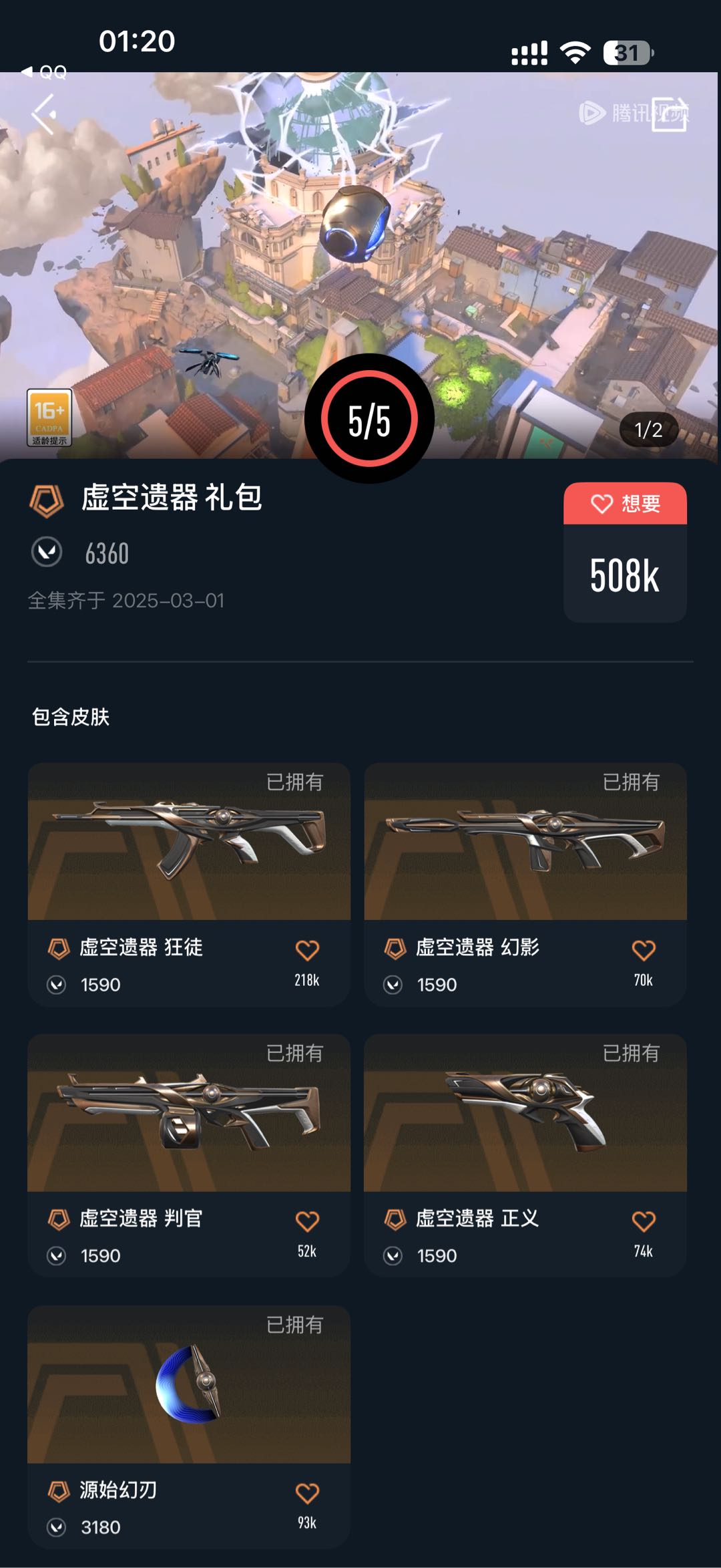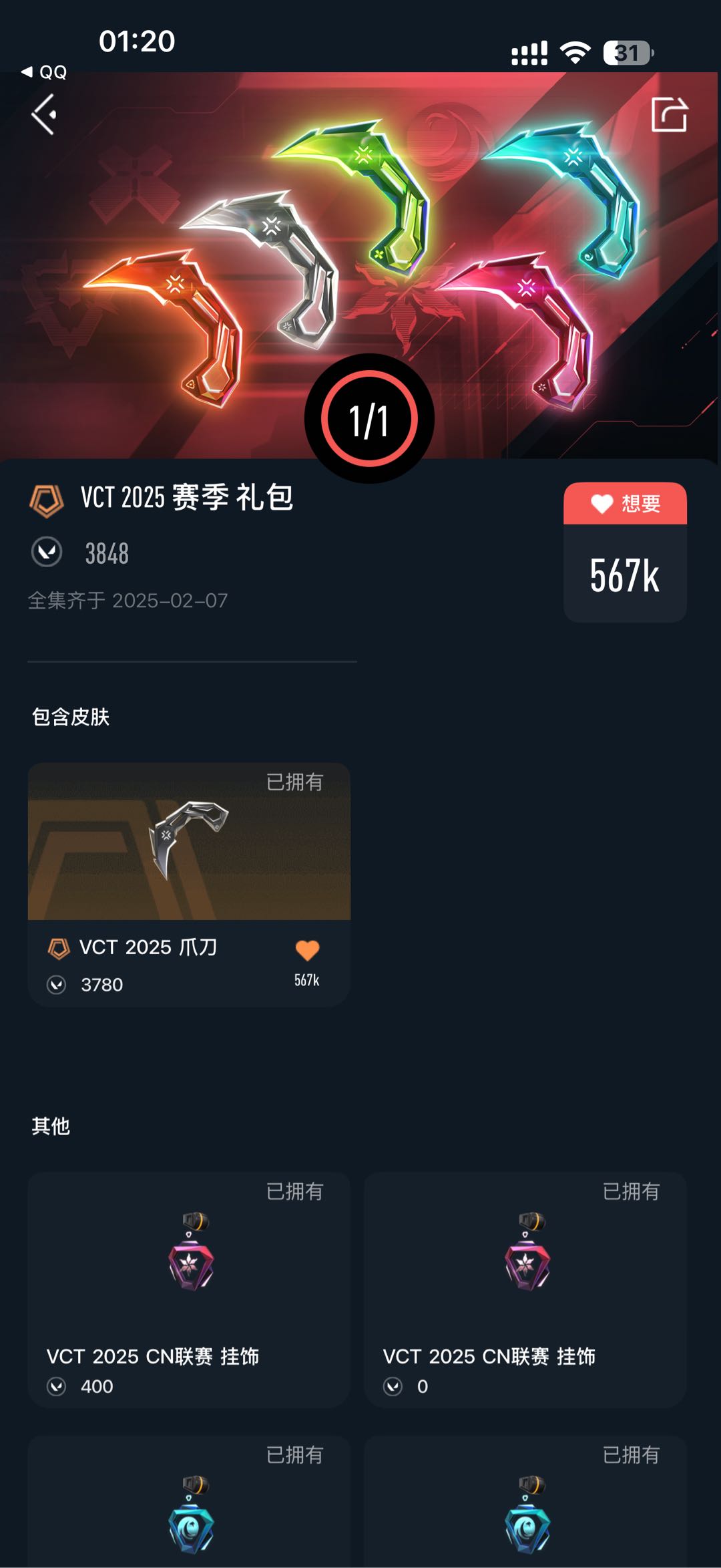 有21把刀,热门的2024冠军套显卡双刀,等众多热门皮肤;西部未来 奥丁,剥皮小刀,镭切,VCT 2025 爪刀,盖亚的复仇 狂徒,虚空遗器 狂徒,源能者娱乐系统 幻影,