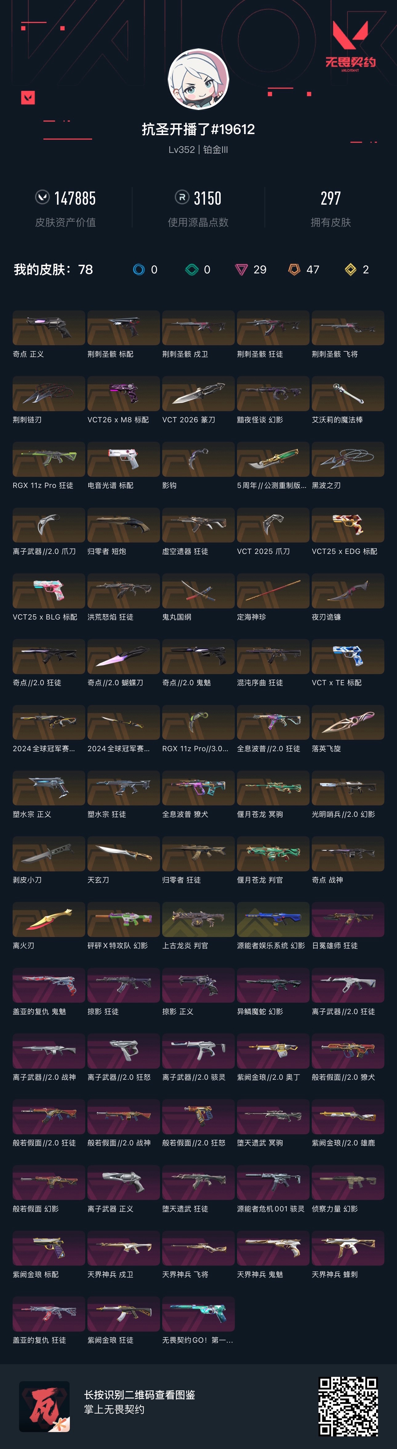 绝版皮肤:近战武器-5周年公测重制版苍龙之刃、近战武器-2024全球冠军赛战刀、近战武器-VCT2025爪刀、近战武器-离火刃、幻影-2024全球冠军赛 近战武器:近战武器-离火刃、近战武器-合金战车军刀、近战武器-弧光异彩军刀、近战武器-天玄刀、近战武器-定海神珍、近战武器-沙尘幻旅匕首、近战武器-剥皮小刀、近战武器-黑波之刃、近战武器-钢轨卫士战锤、近战武器-珍珠棘贝短剑、近战武器-落英飞旋、近战武器-流星兵团短剑、近战武器-闪耀之星荧光棒、近战武器-显卡3.0爪刀、近战器-2024全球冠军赛战刀、近战武器-夜刃诡镰、近战武器-超限闪存匕首、近战武器-奇点2.0蝴蝶刀、近战武器-鬼丸国纲、近战武器-神圣领域战刀、近战武器-VCT2025爪刀、近战武器-离子武器2.0爪刀、近战武器-5周年公测重制版苍龙之刃、近战武器-影钩 鬼魅 鬼魅-数码咒术、鬼魅-信手涂鸦、鬼魅-天界神兵、鬼魅-胡桃狂想、鬼魅-光导纤维、鬼魅-奇点2.0 正义 正义-游戏结束、正义-塑水宗、正义-合金战车、正义-沙尘幻旅、正义-复古浪潮、正义-离子武器、正义-掠影 标配 标配-紫阙金琅、标配-超能冲撞、标配-最终庇护、标配-彩梦之城、标配-光导纤维 短炮 短炮-天才少女、短炮-归零者、短炮-弧光异彩、短炮-钢轨卫士、短炮-深海水族 狂怒 狂怒-花漾粉红、狂怒-萌彩剪影、狂怒-钢轨卫士、狂怒-珍珠棘贝、狂怒-般若假面2.0、狂怒-离子武器2.0 2024VCT手枪 标配-VCTxTE 2025VCT手枪 标配-VCT25xBLG、标配-VCT25xEDG 狂徒 狂徒-紫阙金琅、狂徒-炫彩澎湃、狂徒-盖亚的复仇、狂徒-归零者、狂徒-塑水宗、狂徒-弧光异彩、狂徒-沙尘幻旅、狂徒-钢轨卫士、狂徒-堕天遗武、狂徒-洪荒怒焰、狂徒-全息波普2.0、狂徒-混沌序曲、狂徒-奇点2.0、狂徒-般若假面2.0、狂徒-虚空遗器、狂徒-离子武器2.0 幻影 幻影-砰砰X特攻队、幻影-侦察力量、幻影-光明哨兵2.0、幻影-合金战车、幻影-噬源兽防卫工程、幻影-战术小伙伴、幻影-珍珠棘贝、幻影-般若假面、幻影-源能者娱乐系统、幻影-2024全球冠军赛、幻影-异鳞魔蛇 戍卫 戍卫-花漾粉红、戍卫-彩梦之城、戍卫-天界神兵、戍卫-萌彩剪影、戍卫-钢轨卫士、戍卫-珍珠棘贝 獠犬 獠犬-数码咒术、獠犬-胡桃狂想、獠犬-全息波普、獠犬-弧光异彩、獠犬-战术小伙伴、獠犬-复古浪潮、獠犬-般若假面2.0 蜂刺 蜂刺-天界神兵、蜂刺-胡桃狂想、蜂刺-合金战车、蜂刺-弧光异彩、蜂刺-战术小伙伴、蜂刺-深海水族 骇灵 骇灵-花漾粉红、骇灵-信手涂鸦、骇灵-沙尘幻旅、骇灵-光导纤维、骇灵-源能者危机001、骇灵-珍珠棘贝、骇灵-离子武器2.0 判官 判官-数码咒术、判官-白日幻梦、判官-偃月苍龙、判官-萌彩剪影 雄鹿 雄鹿-彩梦之城、雄鹿-紫阙金琅2.0、雄鹿-复古浪潮 莽侠 莽侠-深海水族 飞将 飞将-信手涂鸦、飞将-天界神兵、飞将-合金战车、飞将-沙尘幻旅、飞将-光导纤维 冥驹 冥驹-花漾粉红、冥驹-偃月苍龙、冥驹-胡桃狂想、冥驹-堕天遗武、冥驹-复古浪潮 奥丁 奥丁-信手涂鸦、奥丁-紫阙金琅2.0、奥丁-战术小伙伴 战神 战神-数码咒术、战神-奇点、战神-萌彩剪影、战神-深海水族、战神-般若假面2.0、战神-离子武器2.0 热门卡面 情人节捷风卡面、VCTCN首冠卡面、2024全球冠军赛卡面、VCT2025美洲联赛卡面、VCT2025太平洋联赛卡面、VCT2025CN联赛卡面、VCT2025EMEA联赛卡面、VCT25xBLG卡面、VCT25xEDG卡面、离火刃凤卡面、离火刃凰卡面、双城之战金克丝卡面、双城之战拥抱卡面、贤者之泪卡面、万圣夜卡面、清风徐来卡面、塑水宗卡面、许愿星砂卡面、势不可挡幽影卡面、势不可挡盖可卡面、势不可挡零卡面、势不可挡星礈卡面、势不可挡KO卡面、天界神兵卡面、星宿灿烂猎枭卡面、虹吸式咖啡壶卡面、布鲁诺中校卡面、超能偶像卡面、狼人猎手卡面、逆向独行卡面、分崩离析卡面 热门挂饰 2024全球冠军赛挂饰、VCT2025CN联赛挂饰、VCT2025EMEA联赛挂饰、VCT2025美洲联赛挂饰、VCT2025太平洋联赛挂饰、改变者全球冠军赛奖杯挂饰、奇点2.0挂饰、袖珍捷风挂饰、薰衣草之心挂饰、超能偶像挂饰、幸运星挂饰、传世莲华挂饰、永结同心挂饰、神中神挂饰、金属蝶翼挂饰、双城之战魄罗挂饰、双城之战小蛋糕挂饰、鱼骨头挂饰、幸运中国结挂饰、云开见日挂饰、蓄势待滚挂饰、糖葫芦挂饰、冬日絮语挂饰、针织蜜蜂挂饰、数码咒术挂饰、迷你机甲挂饰、高音谱号挂饰、飞刀挂饰、终章KO小金人挂饰、VCTxEDG挂饰、VCTxTE挂饰、VCTxBLG挂饰;奇点 战神,黑波之刃,离火刃,5周年//公测重制版 苍龙之刃,剥皮小刀,VCT 2025 爪刀,偃月苍龙 判官,