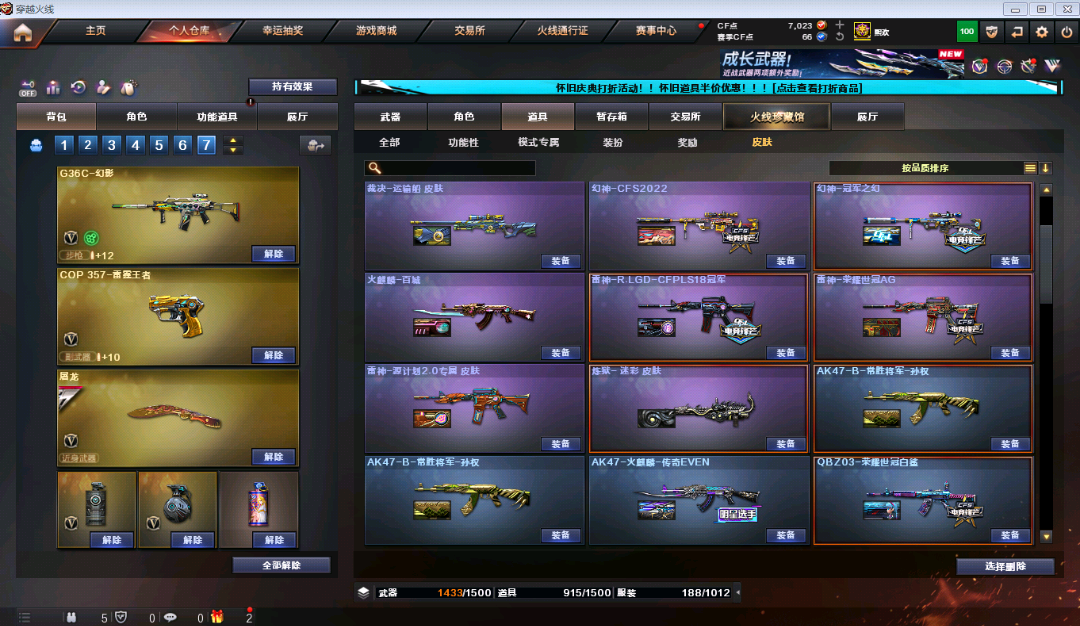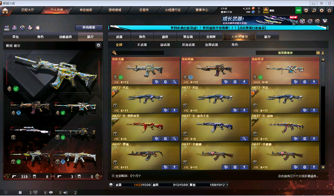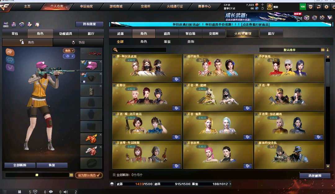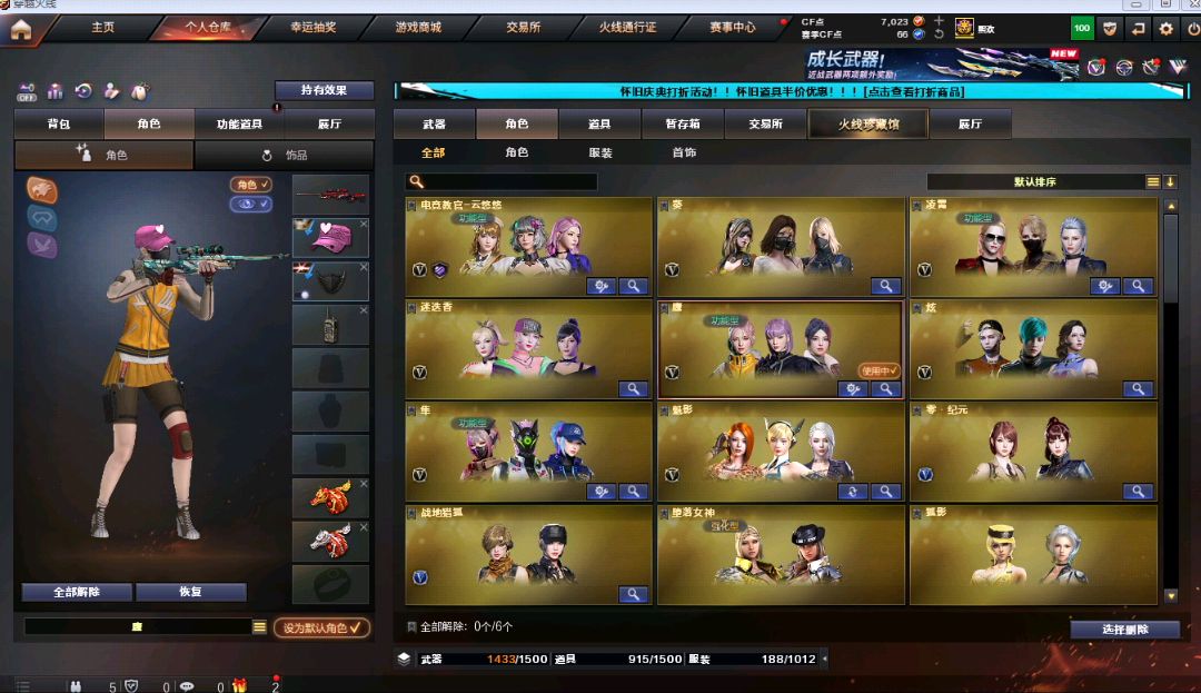 【角色】电竞教官-云悠悠,葵。凌霄,迷迭香,鹰,炫,隼,魅影,战地烈狐,堕落女神。狐影。奇洋探员,乔伊教练,蛇隐宗,王者-葵-貂蝉,王者-零,王者-瞳-闭月羞花,王者-魅影,王者葵-惊若翩鸿,王者零-华冠丽服,王者涂鸦,新海报突击队,雪域霜狐, 【主武器】传说光耀,传说暗裔,传说圣灵,M200-幻神,M4A1-千变,AK47-火麒麟,M4A1-黑龙,AK47-麒麟,M4A1-雷神,M4A1-黑骑士,AK47-无影,M4A1-死神,AK47-黑武士,AK12-天启,AN94-超新星,M4A1-武圣,AK47-机械迷城,AK47-黑鲨,如果弹出设备锁不用撤单三分钟内解除 M4A1-龙血,M4A1-雷霆,AK47-雷暴,M4A1-青龙,M4A1-堕天神,HK417-朱雀,无影-神兵利器,g36c-幻影,黑武士-锦绣游龙,金色蔷薇-古蛇迷踪,死神-雪域霜狐,M4A1-玫瑰精灵,QBZ03-金色蔷薇,Scar Linght-白虎,M4A1-夜魔,M4A1-猎神,9A-91-烈火,AK47-猩红传说,AK47-B-战神,AK47-B-战士,荣耀世冠-火麒麟,荣耀世冠-雷神,AK47-B-身先士卒,AK47-B-常胜将军,AWM-天龙,Barrett-毁灭,Barrett-极光,AWM-裁决。Barrett-雷霆,Barrett-朱雀,Kar98K-星神,M200-竞技荣光,Barrett-金色蔷薇,RPK-盘龙*7;加特林-炼狱*4,炼狱-悦蓝,汤姆逊-烈龙*7.AA-12-雷霆,炫金火麒麟,炫金无影,炫金雷神,炫金骑士,炫金毁灭,王者炎心,王者之心,王者之翼,王者火魄,QBZ03-王者蔷薇,M4A1-雷霆王者,王者火魄,王者之幻,王者之魄,王者之势,王者之武,Barrett-雷霆王者,王者之决,王者之力,王者之怒, 【副武器】沙鹰-修罗,沙鹰-天神,炫金修罗,COP 357-雷霆王者,USP-雷暴,COP-堕天神,破空枪刃-夜魔。柯尔特-竞技荣光,柯尔特-无冕之王,修罗-古蛇迷踪。荣耀世冠-柯尔特,王者之魂, 【近身武器】屠龙。龙啸, 擎天,麒麟刺、尼泊尔-雷霆,斩神刀-雷暴,麒麟刺-堕天神,龙啸-堕天神,马来剑-夜魔。幻灵之锋,擎天-竞技荣光,荣耀世冠-龙啸,雷霆王者之锋,王者之锋,王者之击,王者之啸, 【投掷武器】雷霆套,雷暴套,堕天神套,夜魔套,云龙套,幻灵套, 【音效卡】Kar98K-星神音效卡,M4A1-黑骑士音效卡,Barrett-毁灭音效卡,QBZ03-金色蔷薇音效卡,Scar Linght-白虎音效卡,M200-幻神音效卡,AK47-火麒麟音效卡,M4A1-雷神音效卡,Barrett-毁灭音效卡,死神-雪域霜狐音效卡, 【皮肤】幻神-CFS2022.幻神-冠军之幻,屠龙-星耀皮肤,QBZ03-CFS2024皮肤,金色蔷薇-量子蔷薇皮肤,黑骑士-白马银枪,龙啸-纸灯笼皮肤,屠龙-星火燎原,黑骑士-摸金校尉,白虎-巅峰荣耀皮肤,雷神-源计划2.0专属皮肤,火麒麟-百城,雷神-荣耀世冠AG,雷神-RL-GD-CFPLS18冠军,裁决-羽掣皮肤,QBZ03-巅峰荣耀皮肤,白虎-霓虹机甲皮肤,屠龙-惊鸿皮肤,修罗-星空,无影耀金皮肤,雷神-星空,黑骑士耀金皮肤,火麒麟-雷神。黑龙-暗月,擎天-蒸汽钟表皮肤,修罗-能量核心,天启-暗月,无影-暗月,毁灭-浙江百城皮肤,修罗-能量核心,黑龙-能量核心,毁灭-暗月,天神-暗月,修罗-能量核心,QBZ白鲨,雷神虎牙,,黑骑士马超,黑骑士AG,毁灭冠军,荣耀三件套等;USP-雷暴,柯尔特-无冕之王,荣耀世冠-柯尔特,隼,电竞教官-云悠悠,RPK-盘龙,QBZ03-金色蔷薇,