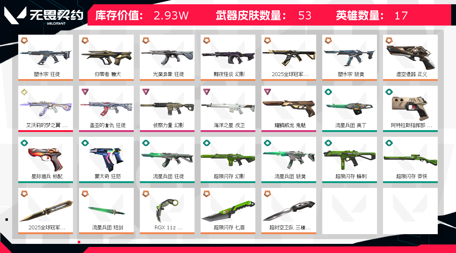 首页 > 租号大厅 > 无畏契约-wegame > wegame/wegame > 25冠军套,三棱军刺等高质量akm4刀皮,全英雄,可排位可匹配,不可开挂,不可挂机即可。