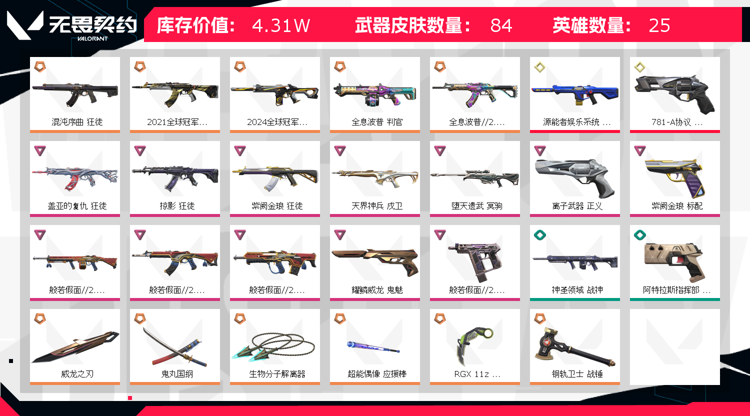 首页 > 租号大厅 > 无畏契约-wegame > wegame/wegame > ✨4.5w库存✨21冠军狂徒✨威龙套✨弃王狙✨24冠军幻影✨混沌序曲狂徒✨显卡刀✨生物离子分解