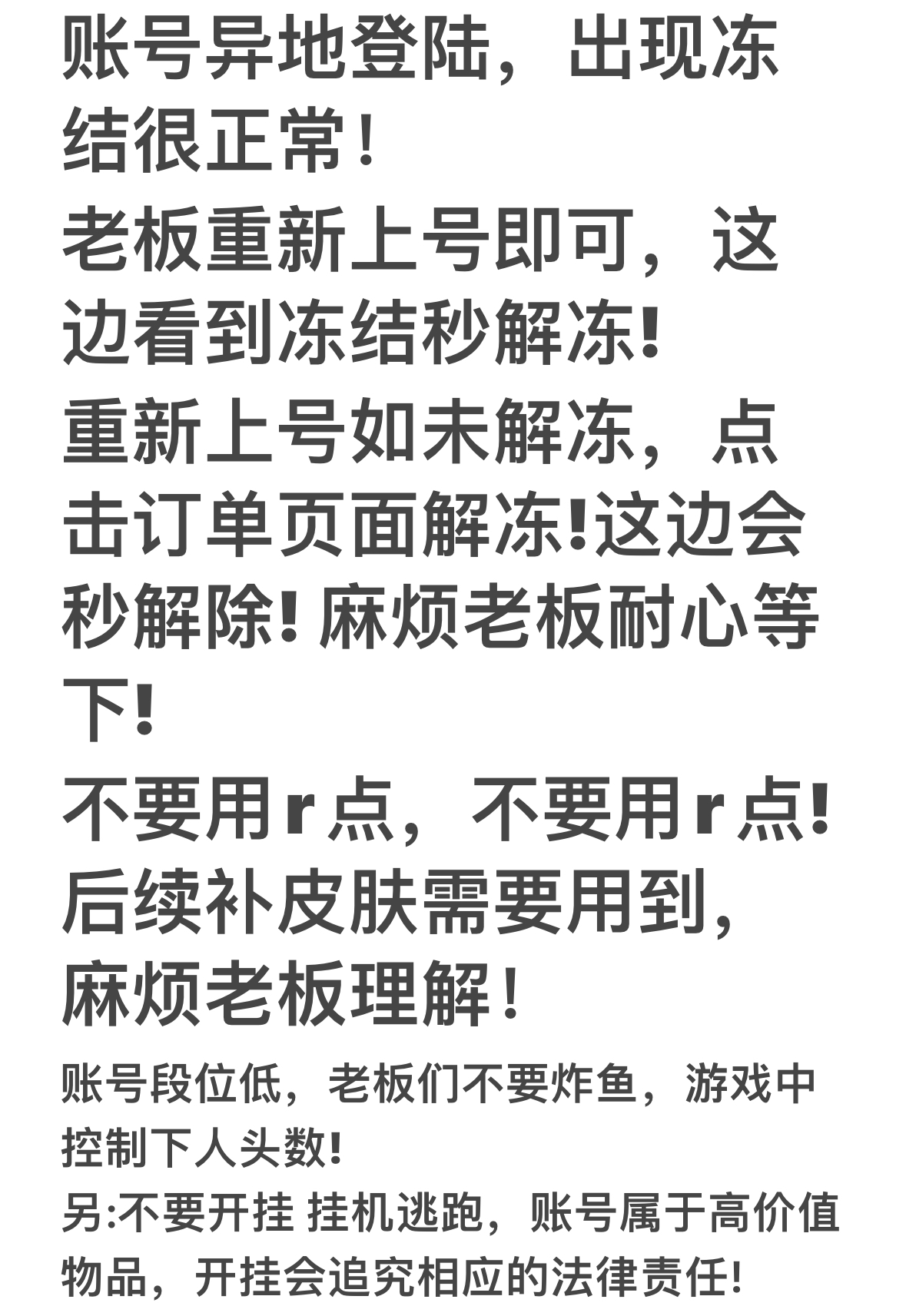 租号过程中任何问题 添加绿泡泡Cry7ian 凡租用此号及视为同意以下条例: 1.炸鱼选手请控制KD,杀人数在25左右或25以下,违规撤单拉黑! 2.违规使用DMA,内存挂,鼠标宏等第三方插件或软件不论封号与否,立马保存后台视-频,截取订单信息。只要后期出现封号十年且违规时间对应租号期间即视为恶意毁号账号,损害公民个人财产行为。以账号充值价格赔付,账号归你。(本店独享上号器,DMA不要心存侥幸,当你上号器登录游戏时,电脑运行日志已经截取) 3.订单结束账号无问题押金即退。 该账号后台24小时视-频监控,机器码立马拉黑,正常异地封禁排位不做处理。凡出现6+24,6+72,6+168以及30天立马标记租号人订单信息并视-频保存,后期出现十年调档调取租客信息,本店已拉黑不良租客500多名,上报永久封禁DMA账户100多名,成功追溯理赔金额超35W。;