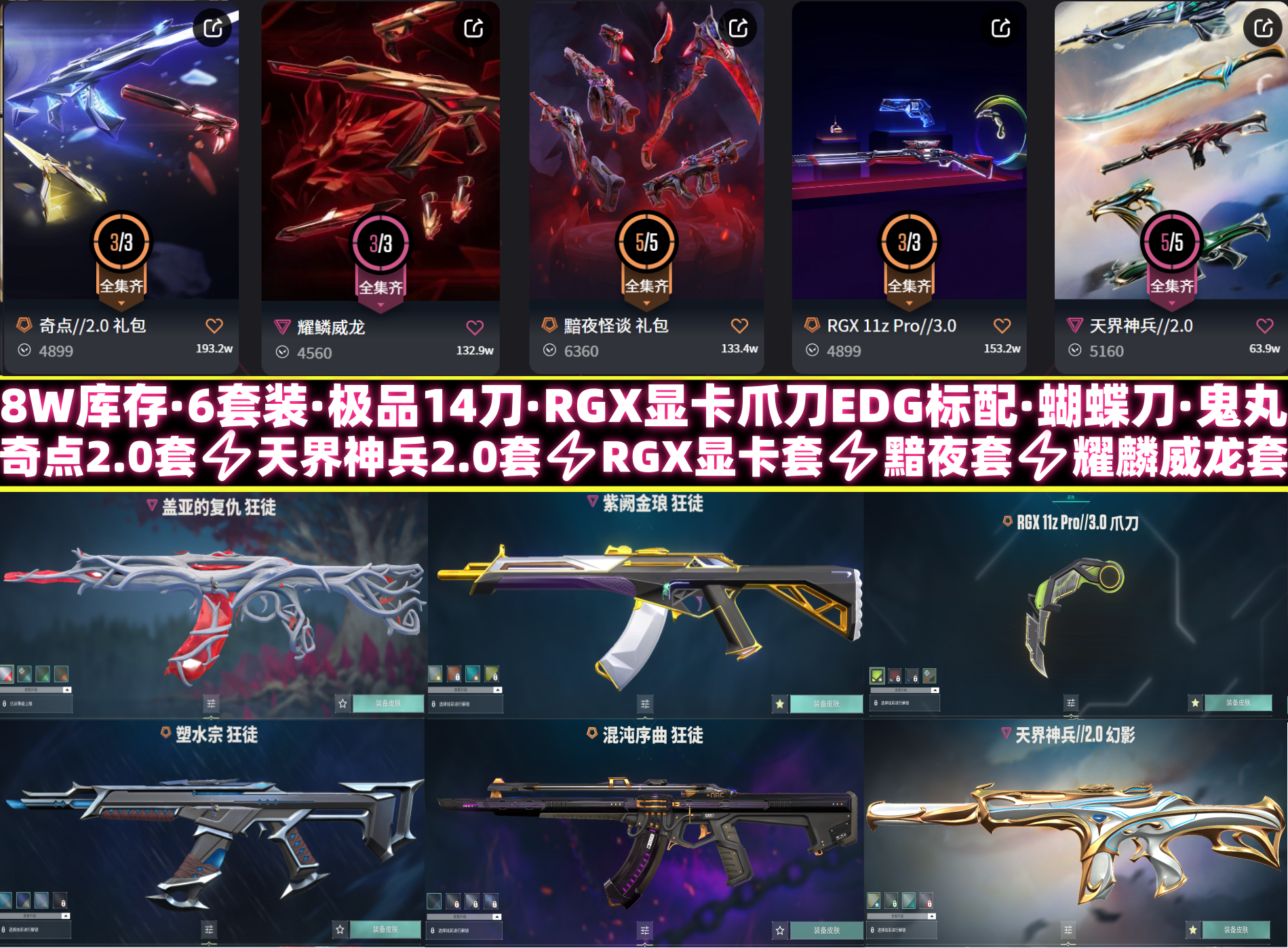 8W库存⚡5套装⚡极品14刀⚡剥皮小刀⚡蝴蝶刀⚡3.0显卡爪刀⚡盖亚紫金混沌塑水⚡天界神兵套⚡黯夜套