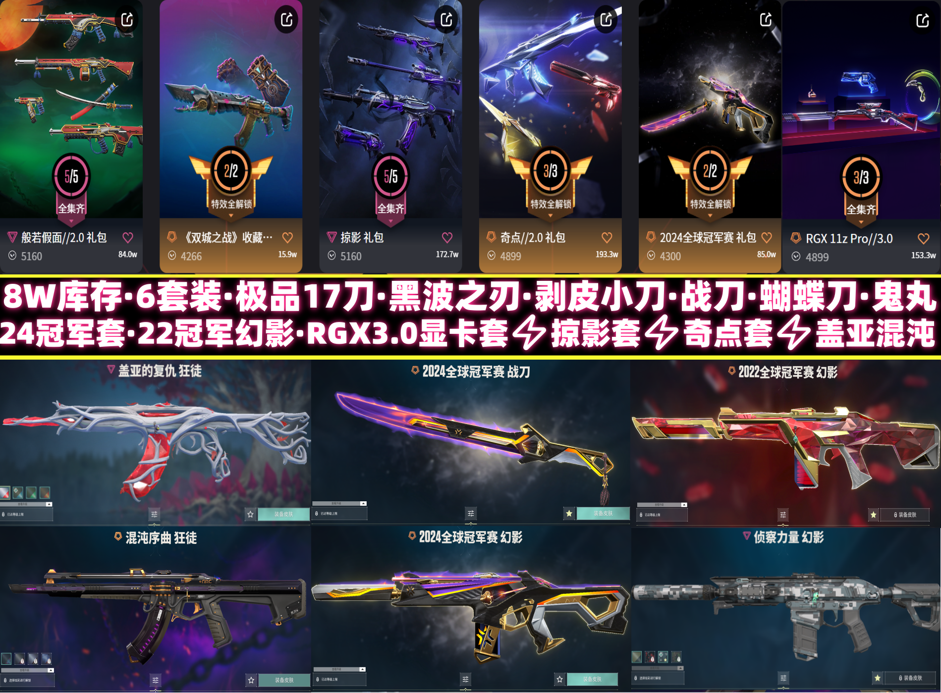 8万库存6套装⚡24冠军套22冠军幻影⚡极品17刀⚡战刀剥皮小刀⚡黑波之刃3.0爪刀⚡盖亚混沌艾沃莉
