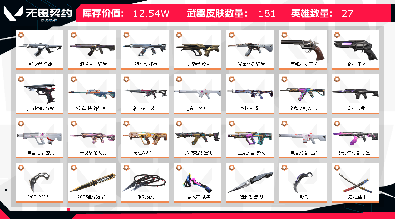 请勿挂机,游戏中挂机拉黑!!!禁止使用R点!!!排位被封次数较多,再封就是30天以上了,所以暂时禁止排位。 请求看看描述! 账号R点请勿使用,本店铺及时补充新套装,若使用R点无法升级新套装,攒R点辛苦,望谅解! 老板不要杀太多,现在风控的严重,杀多了会临时冻结,到时候我可能不在无法解冻!使用外挂脚本导致游戏账号封禁直接向平台提取ip地址! 本账号经过网络财产备案,一经发现直接报警处理立案追责,根据账号价值全额赔偿感谢支持谢谢合作谢谢合作!!!!禁止利用账号进行开挂、使用辅助违规软件诈骗等违规操作!;VCT 2025 爪刀,归零者 獠犬,盖亚的复仇 狂徒,噬影者 狂徒,侦察力量 幻影,紫阙金琅 狂徒,混沌序曲 狂徒,