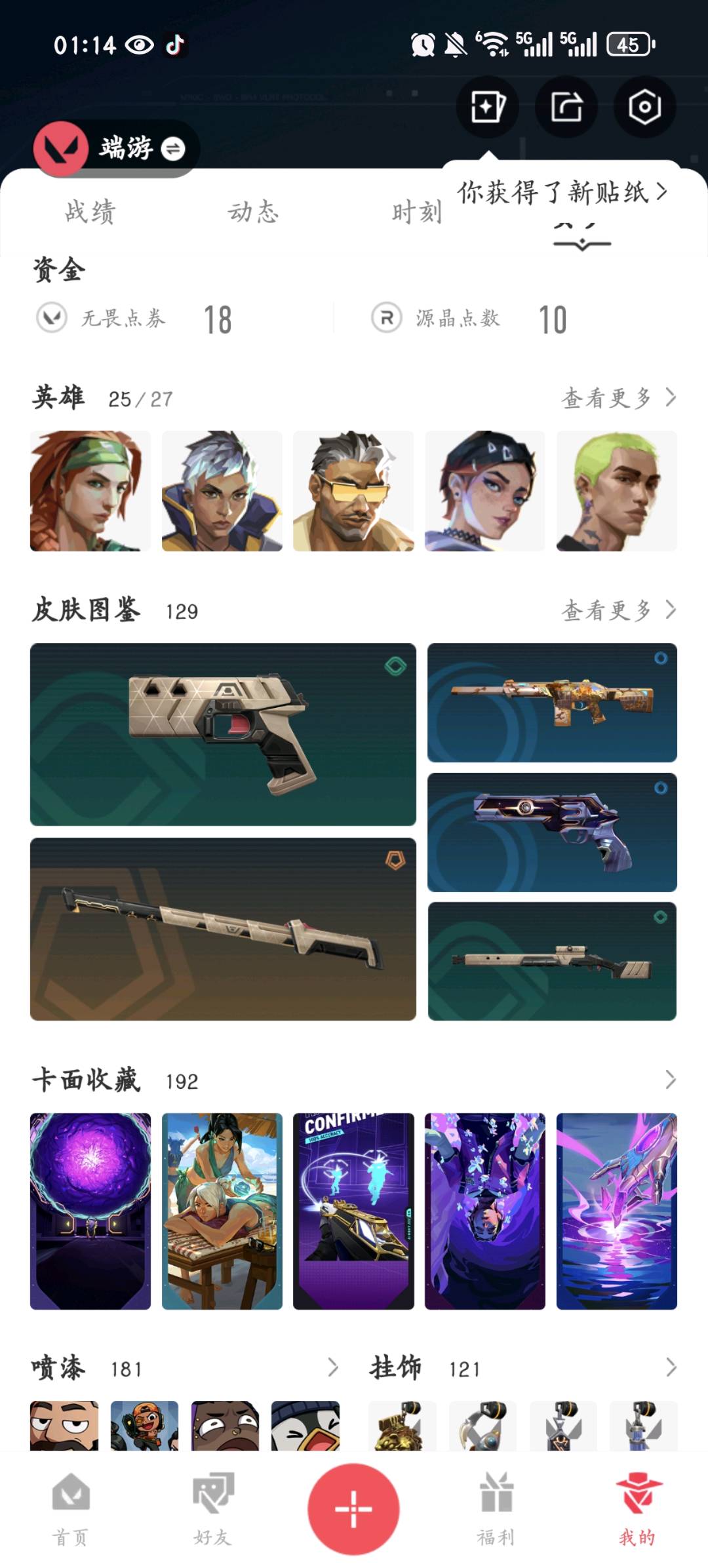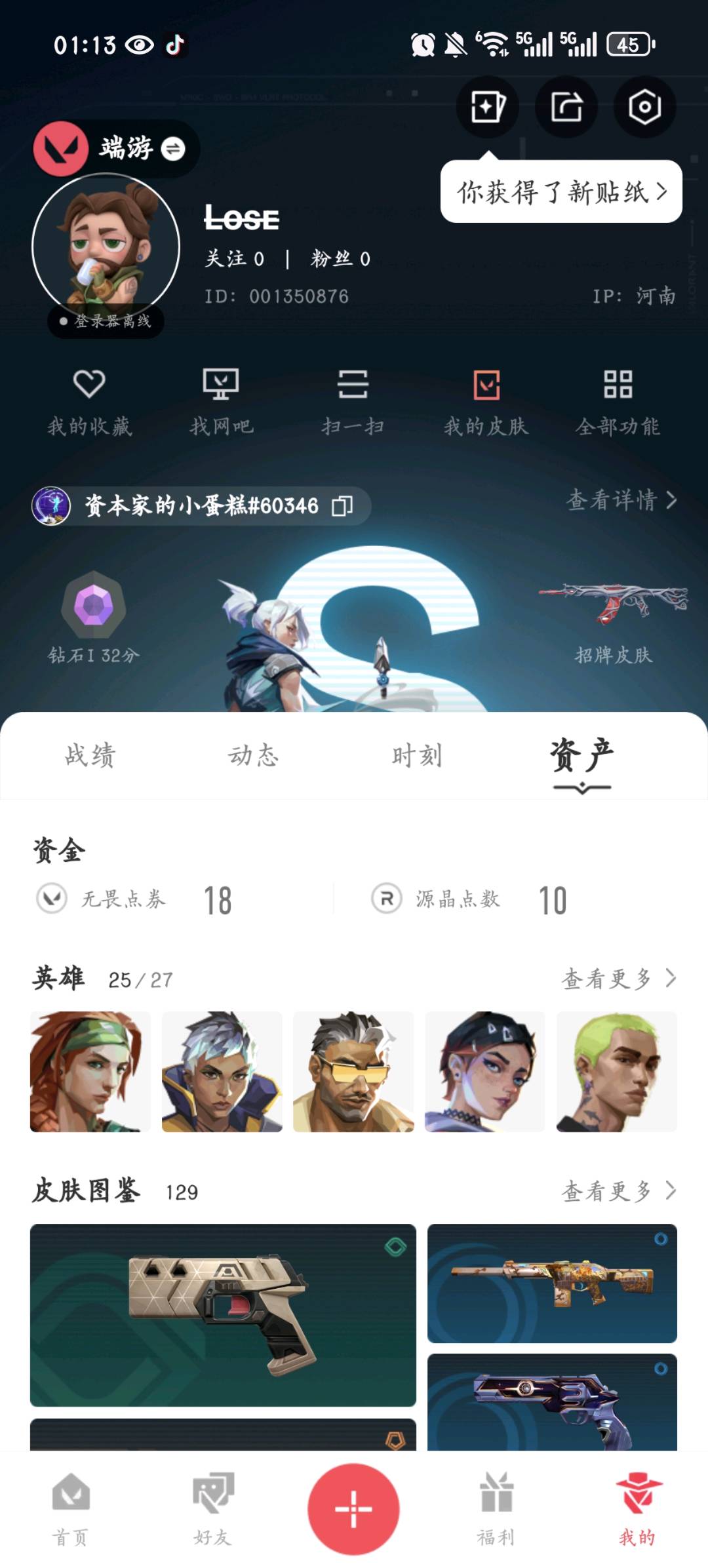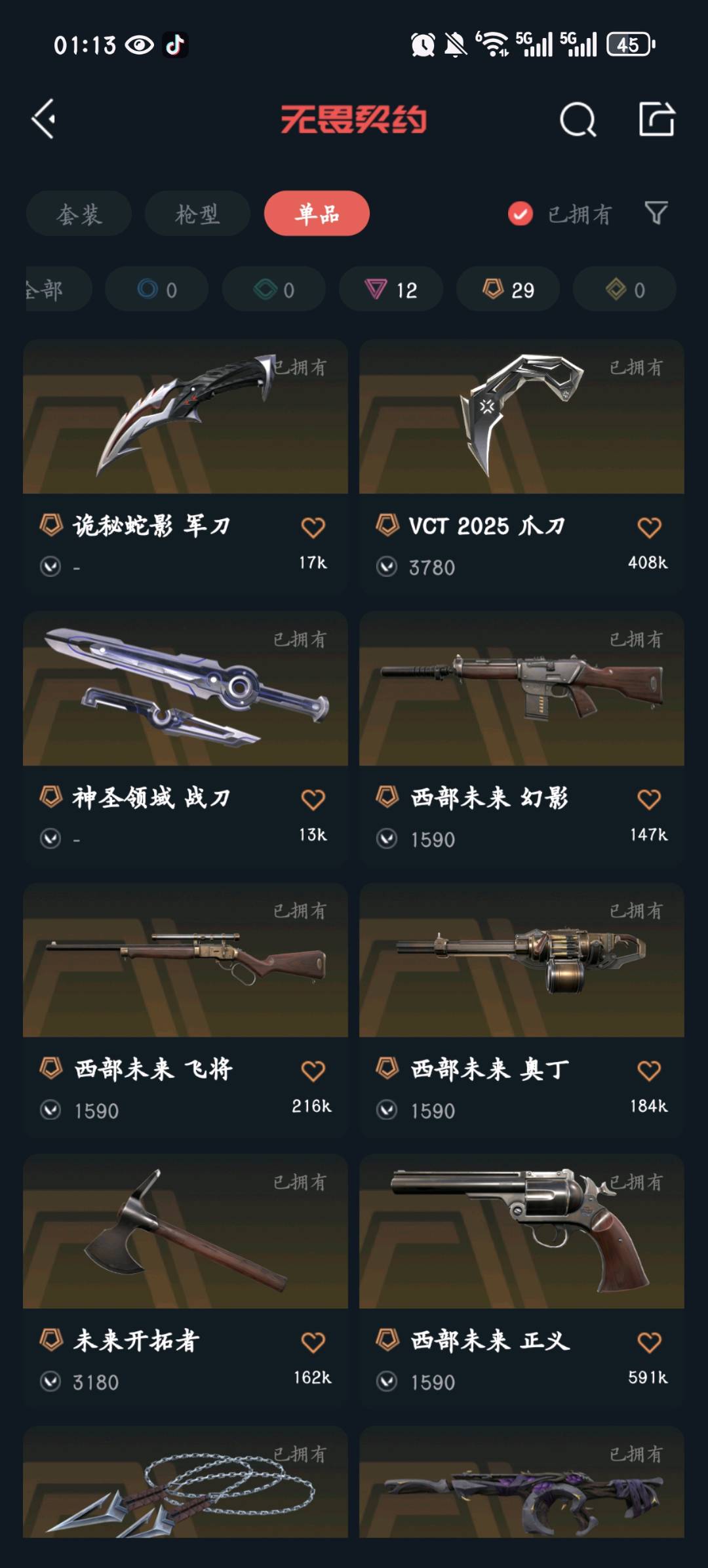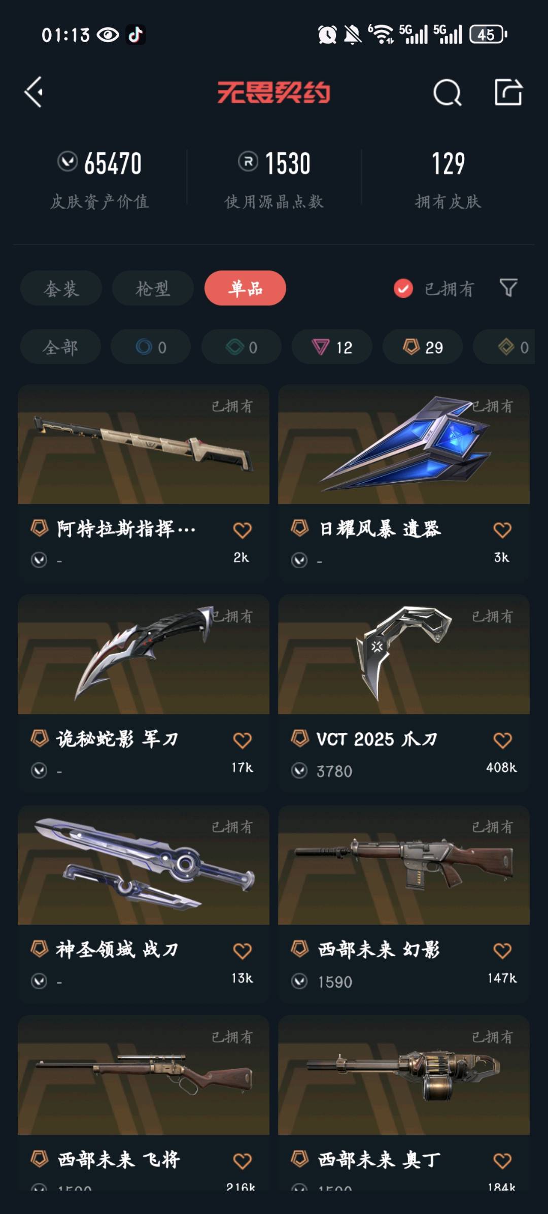 主流武器都有皮肤基本都升满了英雄就差ko和蝰蛇就满了钻石一段位;砰砰X特攻队 奥丁,西部未来 奥丁,黑波之刃,威龙之刃,VCT 2025 爪刀,起源 雄鹿,盖亚的复仇 狂徒,