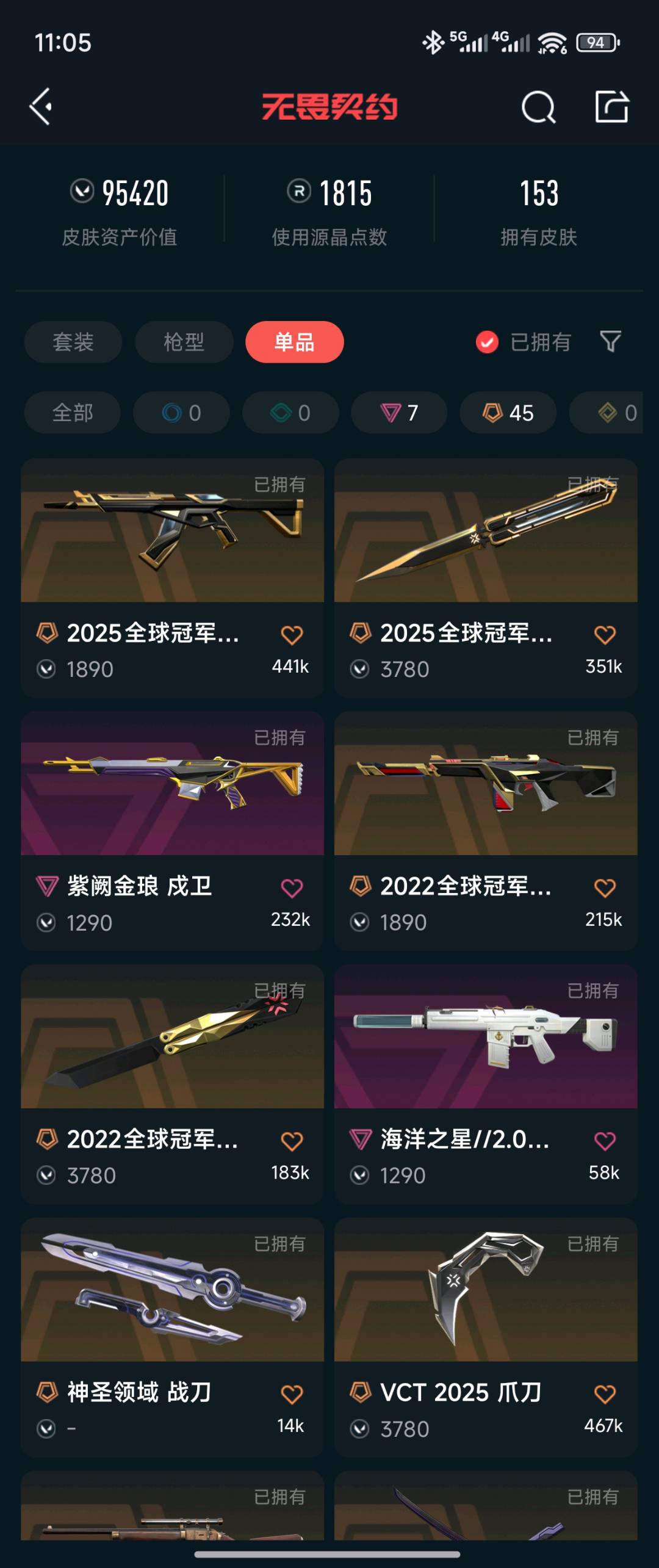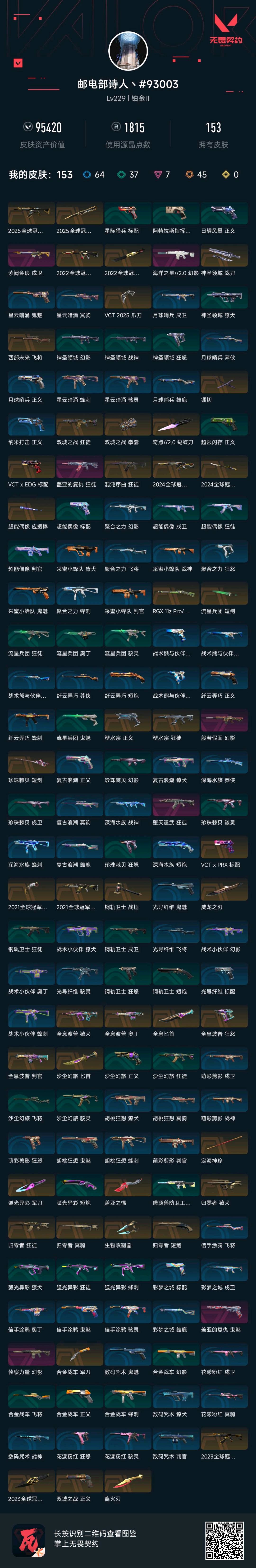 153皮⭐全英雄⭐账号价值95420⭐热门狂徒幻象皮⭐冠军套⭐vct爪刀⭐雷切⭐金箍棒⭐离火刃等