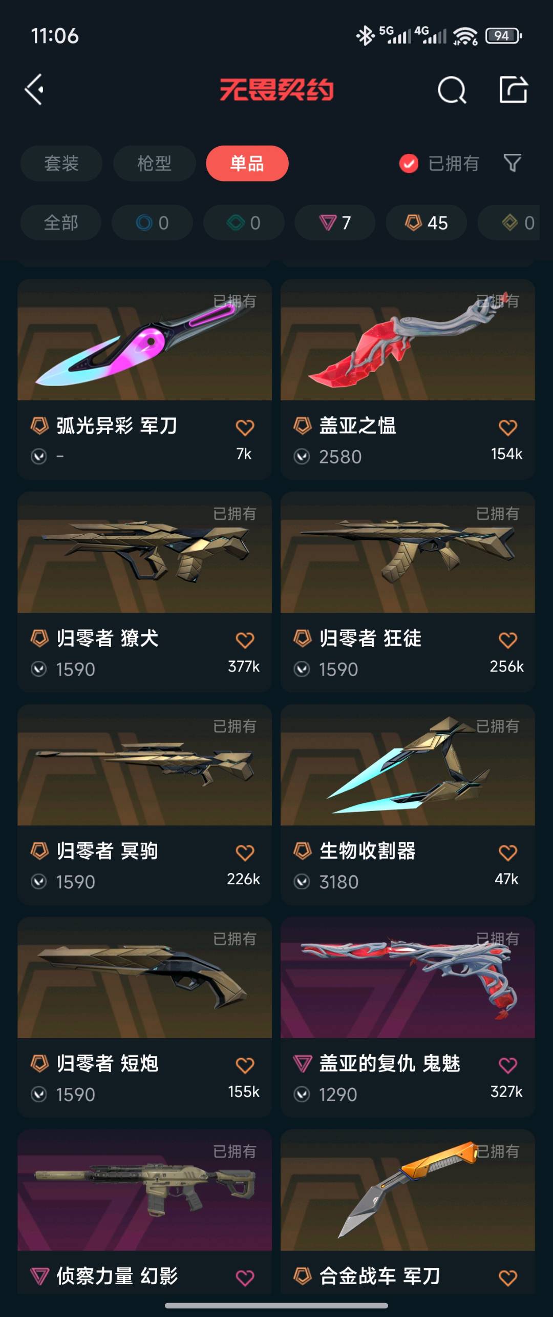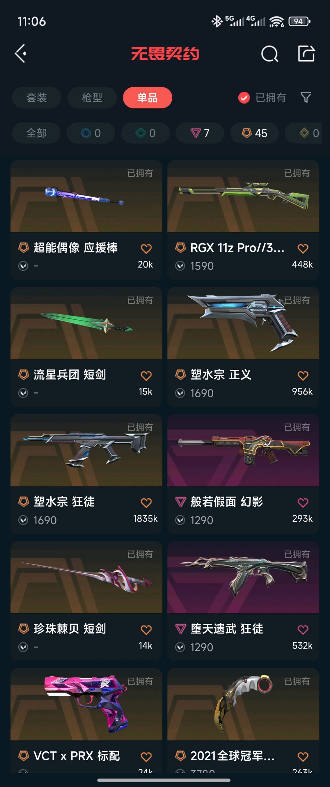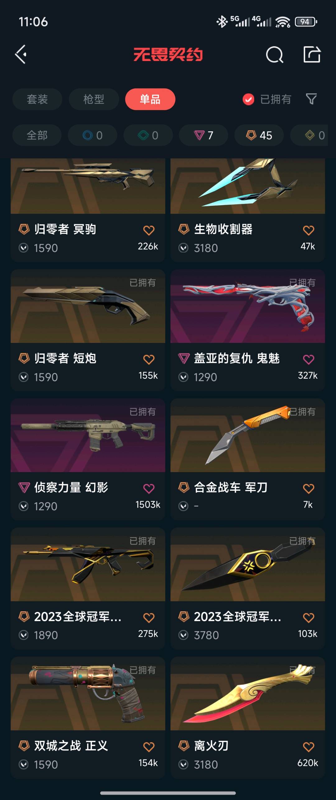 全英雄,21-24冠军套全套,25vct爪刀,雷切,奇点蝴蝶刀,离火刃等 狂徒:混沌 塑水 堕天 21 23冠军 归零者 双城 归零 幻象:侦查 22 24冠军 般若 鱼缸 大狙:归零者 莽侠:显卡 鸟狙:西部 正义:双城塑水 鬼魅:盖亚 标配:24edg prx;离火刃,镭切,威龙之刃,VCT 2025 爪刀,归零者 獠犬,盖亚的复仇 狂徒,侦察力量 幻影,