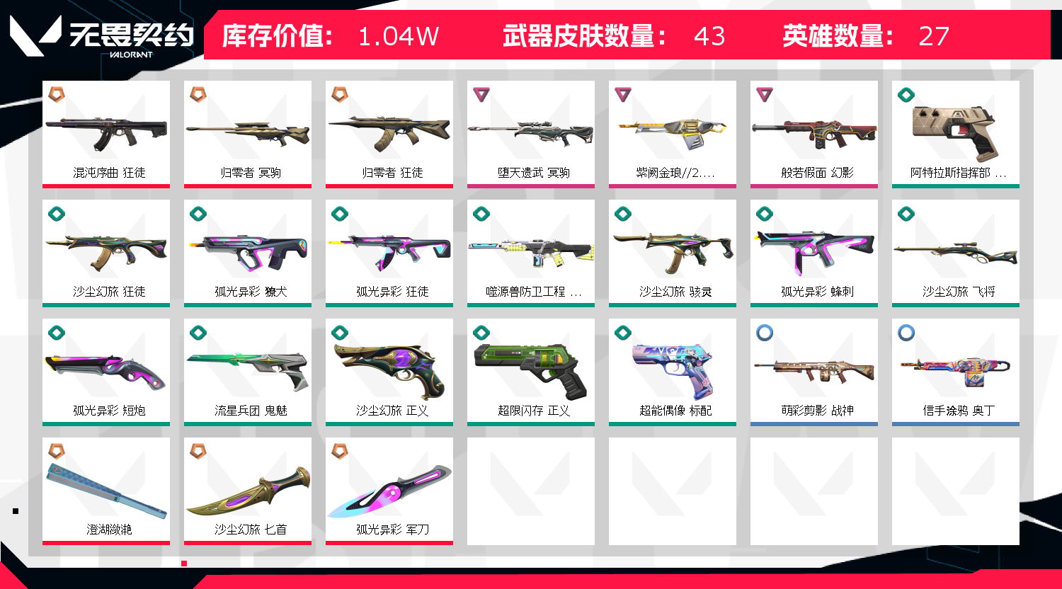 允许 英雄27 武器皮肤数量43;混沌序曲 狂徒,堕天遗武 冥驹,归零者 冥驹,