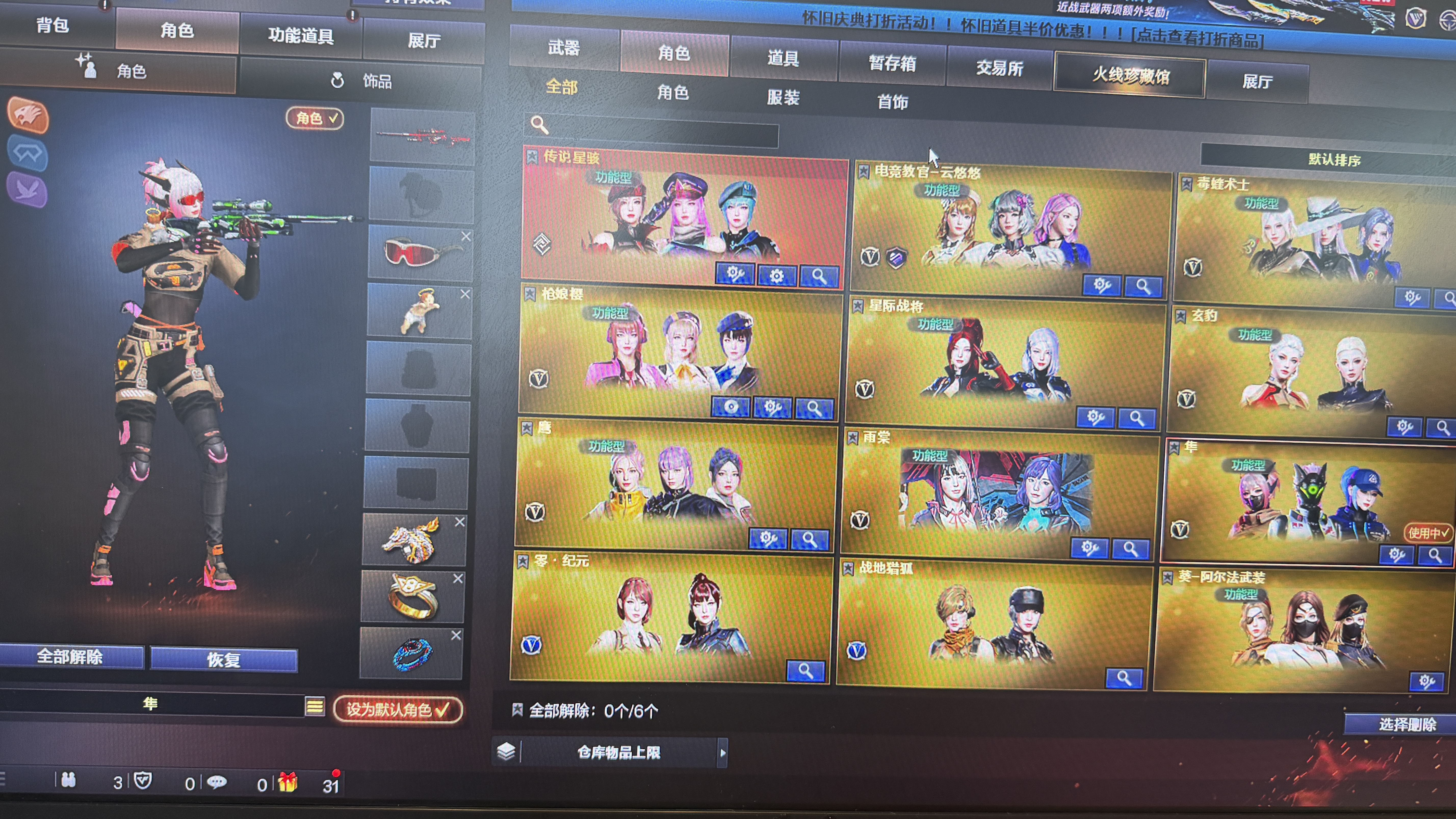 深度生化号,六盘龙,六猎龙,生化角色,传说角色,泡泡象,蝴蝶刀,小孩(wcn)别租,;柯尔特-无冕之王,传说幽冥,炽芒蝶刃,传说星骇,隼,电竞教官-云悠悠,RPK-盘龙,