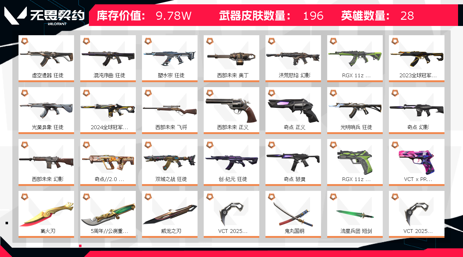 首页 > 租号大厅 > 无畏契约-wegame > wegame/wegame > 10W库存⚡离火刃 22 23 24冠军 光荣异象 双城之战⚡20把狂徒+8把幻影⚡苍龙之刃 鬼丸