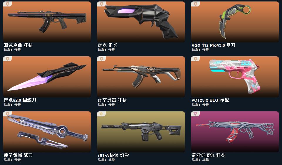 冻结秒解,看描述。RGX显卡爪刀,奇点蝴蝶刀,极品AK号,紫金,盖亚的复仇,混沌序曲,虚空遗器,奇点正义,协议幻影,全英雄