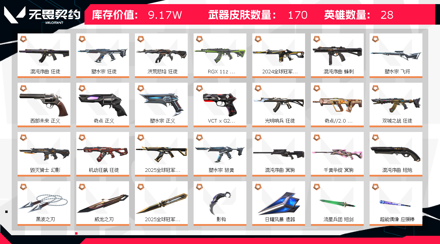 首页 > 租号大厅 > 无畏契约-wegame > wegame/wegame > 极品19刀🔥9.1w🔥库存167皮🔥222425冠军主战皮肤多🔥 塑水宗掠夺混沌 显卡流脓