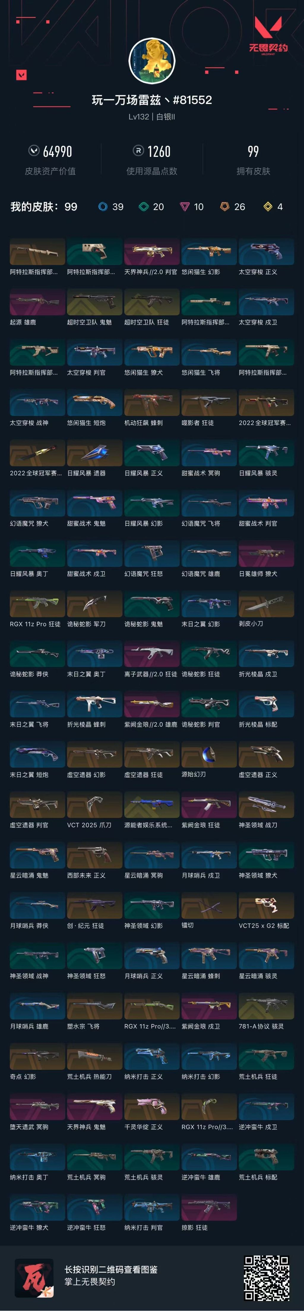 ✅冻结看wegame个人信息✅ 【拥有套装】2022全球冠军赛套装(2022全球冠军赛-幻影,2022全球冠军赛-蝴蝶刀)虚空遗器套装(虚空遗器-狂徒,虚空遗器-幻影,虚空遗器-判官,虚空遗器-正义,源始幻刃) 【拥有近战武器】VCT-2025-爪刀,镭切,RGX-11z-Pro//3.0-爪刀,剥皮小刀 【拥有步枪】RGX-11z-Pro-狂徒,噬影者-狂徒,创·纪元-狂徒,奇点-幻影,超时空卫队-狂徒,源能者娱乐系统-幻影,离子武器//2.0-狂徒,紫阙金琅-狂徒,紫阙金琅-戍卫,日冕雄师-獠犬,掠影-狂徒 【拥有狙击枪】塑水宗-飞将,RGX-11z-Pro//3.0-莽侠,堕天遗武-冥狙 【拥有机枪】日耀风暴-奥丁,神圣领域-战神,太空穿梭-战神,末日之翼-奥丁,纳米-奥丁 【拥有冲锋枪】机动狂飙-蜂刺,781-A协议-骇灵,阿特拉斯指挥部-骇灵,日耀风暴-骇灵,荒土机兵-骇灵,折光棱晶-蜂刺,星云暗涌-蜂刺,星云暗涌-骇灵 【拥有霰弹枪】紫阙金琅//2.0-雄鹿,天界神兵//2.0-判官,起源-雄鹿,诡秘蛇影-判官,太空穿梭-判官,甜蜜战术-判官,幻语魔咒-雄鹿,月球哨兵-雄鹿,逆冲蛮牛-雄鹿,纳米-判官 【拥有手枪】VCT25-x-G2-标配,西部未来-正义,千灵华绽-正义,超时空卫队-鬼魅,天界神兵-鬼魅,阿特拉斯指挥部-标配,日耀风暴-正义,诡秘蛇影-鬼魅,神圣领域-狂怒,荒土机兵-标配,太空穿梭-正义,悠闲猫生-短炮,甜蜜战术-鬼魅,幻语魔咒-狂怒,折光棱晶-标配,末日之翼-短炮,星云暗涌-鬼魅,月球哨兵-正义,纳米-正义,逆冲蛮牛-狂怒;剥皮小刀,镭切,VCT 2025 爪刀,起源 雄鹿,虚空遗器 狂徒,噬影者 狂徒,掠影 狂徒,