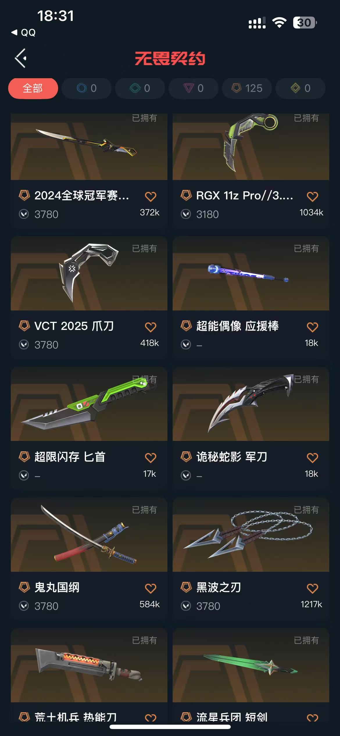 7.5W库存、黑波、鬼丸、蝴蝶刀、显卡爪刀、2024全球冠军、紫阙金琅、RGX狂徒、掠影、混沌、塑水