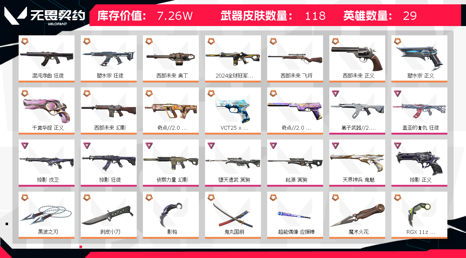 【拥有套装】离子武器//2.0套装(离子武器//2.0-狂徒,离子武器//2.0-战神,离子武器//2.0-骇灵,离子武器//2.0-狂怒,离子武器//2.0-爪刀)西部未来套装(西部未来-幻影,西部未来-奥丁,西部未来-飞将,西部未来-正义,未来开拓者)奇点2.0套装(奇点//2.0-狂徒,奇点//2.0-鬼魅,奇点//2.0-蝴蝶刀)掠影套装(掠影-狂徒,掠影-冥驹,掠影-戍卫,掠影-正义,影刃)