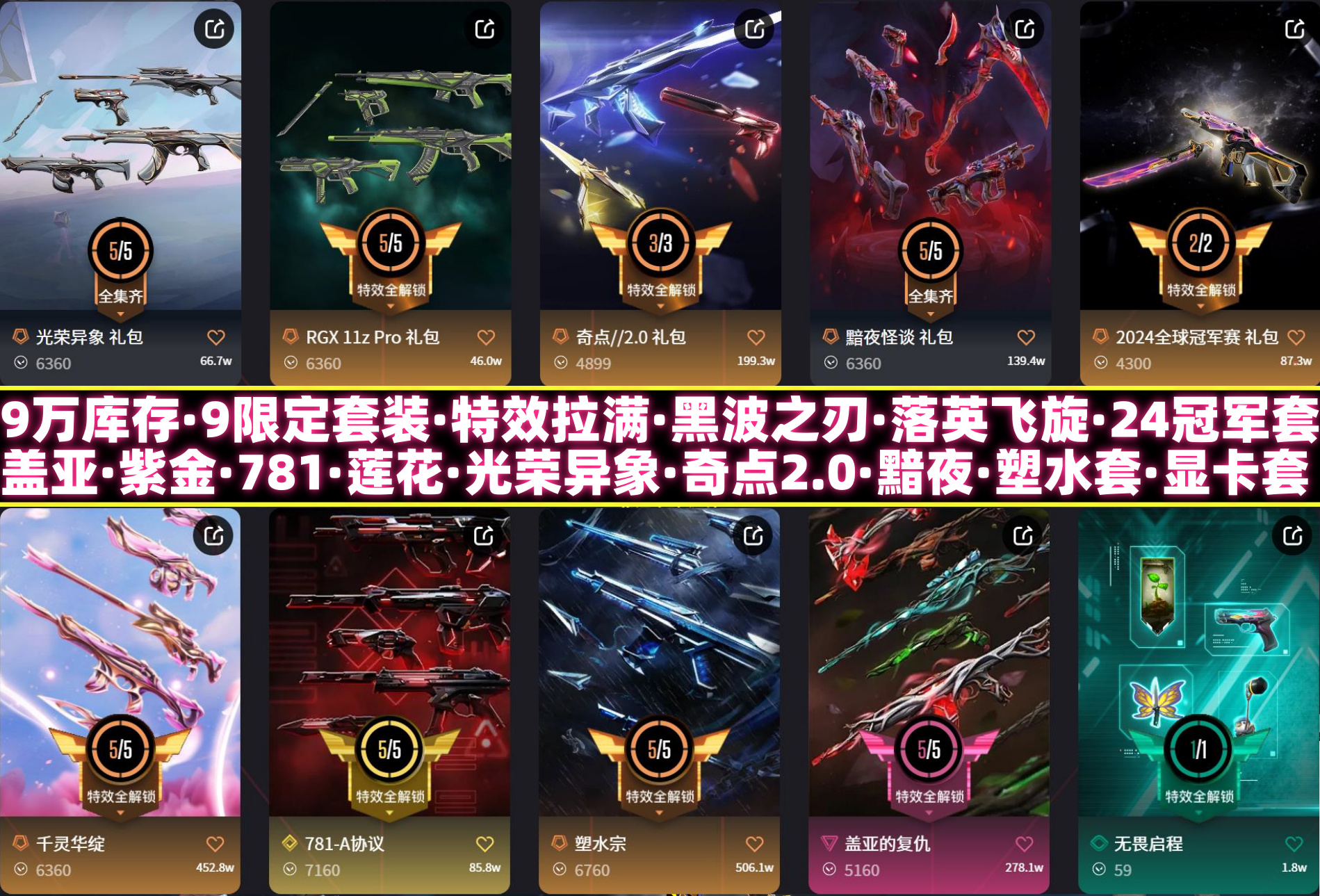 首页 > 租号大厅 > 无畏契约-wegame > wegame/wegame > 9万库存✅9限定套装✅特效拉满单买精品多24冠军套✅黑波之刃蝴蝶刀战刀✅盖亚光荣异象✅莲花套781套