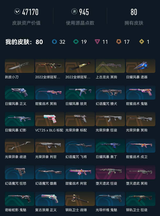 新手练手号❤22冠套❤VCT25标配❤剥皮小刀❤盖亚狂徒❤沙尘幻旅刀❤包天包夜更划算❤
