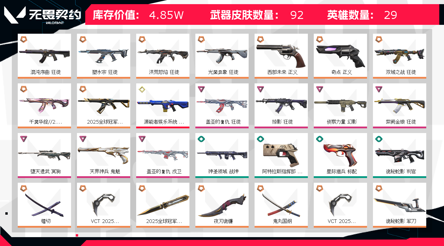4w可排位黄铂金2625冠军狂徒盖亚流脓紫金混沌掠夺/雷切vct/西部正义/弃王大狙/天界鬼魅;镭切,VCT 2025 爪刀,盖亚的复仇 狂徒,洪荒怒焰 狂徒,掠影 狂徒,源能者娱乐系统 幻影,侦察力量 幻影,