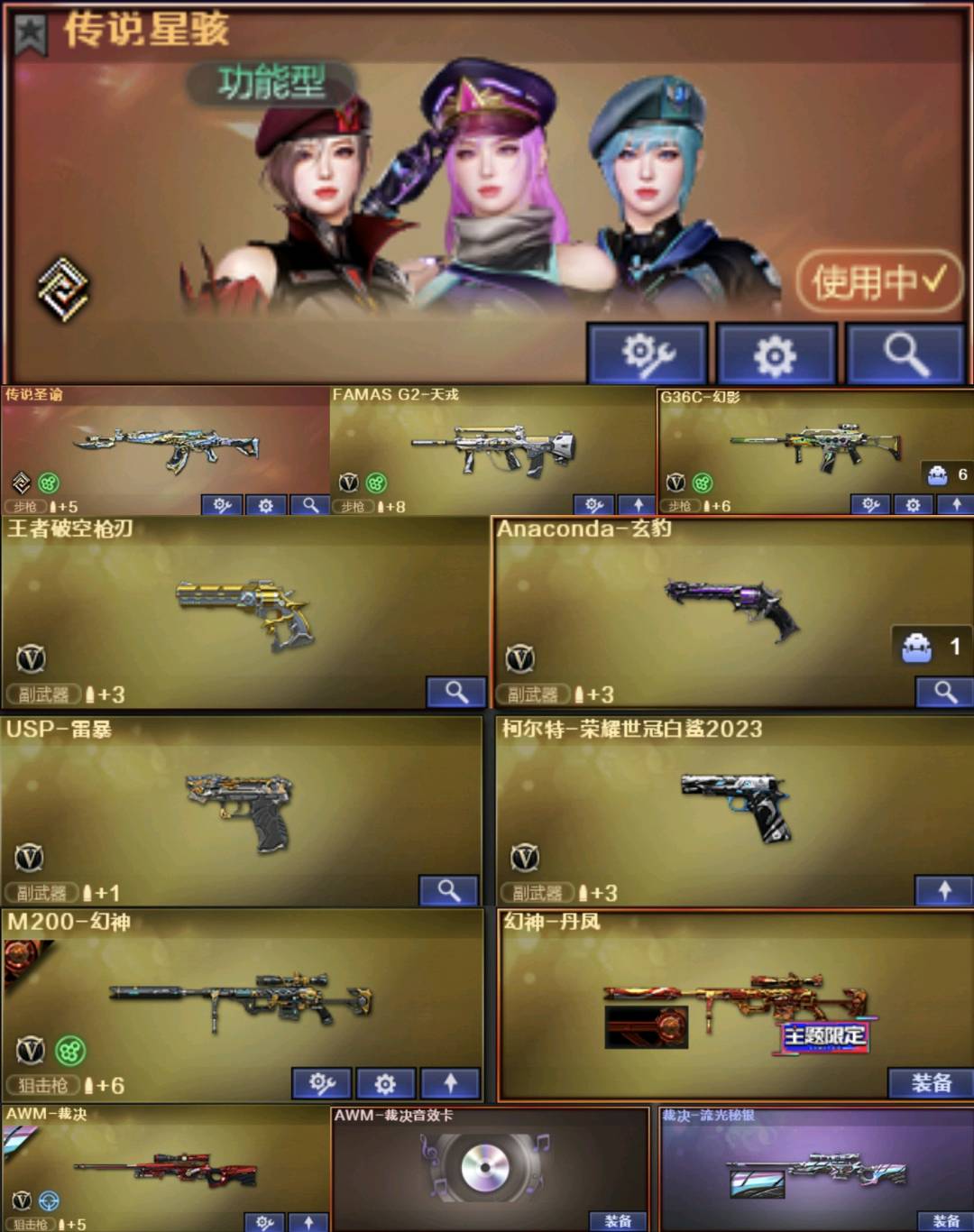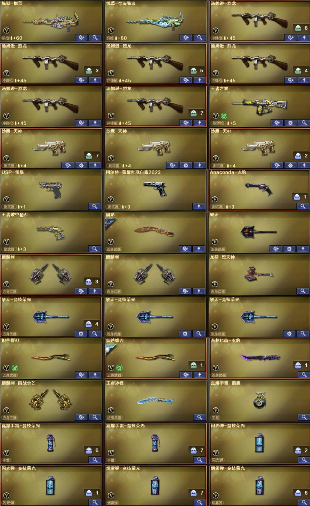 裁决三件套.玄豹套,传说圣谕,传说星骇,法玛斯天荣,幻影,猎手皮,镇魔者,双面神,猎手皮;USP-雷暴,柯尔特-荣耀世冠白鲨2023,炽芒蝶刃,传说星骇,隼,电竞教官-云悠悠,RPK-盘龙,