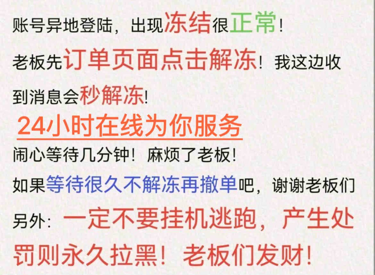 冻结点解冻,等待三分钟重启游戏 炸鱼直接踢下线永久拉黑 恶意退排位恶意无理由撤单一律黑名单 【店铺所有账号均于成都市网监局备案虚拟财产,开挂/鼠标宏/恶意卡BUG等毁号行为,直接联合本平台提供详细信息邮寄律师函!必追责原价赔偿!;黑波之刃,掠影 狂徒,洪荒怒焰 幻影,天界神兵 戍卫,紫阙金琅 骇灵,