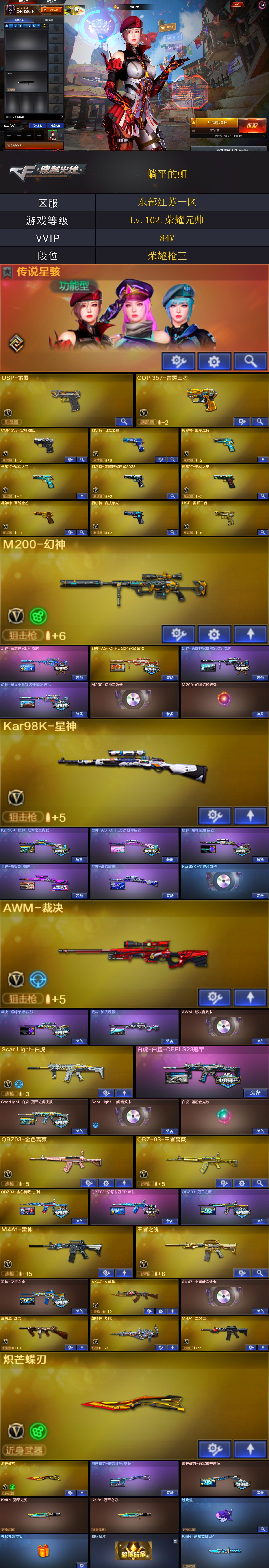 科技大佬手下留情!! 【商品标题】:东部江苏一区-84V-可二次实名-【Lv.102.荣耀元帅】-【段位:荣耀枪王】 【稀有武器】:M200-幻神/Kar98K-星神/ScarLight-白虎/USP-雷暴/柯尔特-竞技荣光/柯尔特-荣耀世冠白鲨2023/柯尔特-无冕之王/修罗-古蛇迷踪/COP357-雷霆王者-觉醒版/柯尔特-冠军之特(2)/金色蔷薇-古蛇迷踪/QBZ03-金色蔷薇/AK47-火麒麟/M4A1-雷神/M4A1-黑骑士/Barrett-毁灭/AWM-裁决/加特林-炼狱/汤姆逊-烈龙/炽芒蝶刃(2)/斩神刀-雷暴/幻灵之锋 【王者武器】:王者之魄-觉醒版/QBZ-03-王者蔷薇-觉醒版 【热门角色】:奇洋探员/蛇隐宗/王者春/王者凌霄/潘多拉-X/海豹突击队/潘多拉 【热门音效卡】:M200-幻神音效卡/Kar98K-星神音效卡/AWM-裁决音效卡/Scar Light-白虎音效卡/M4A1-黑骑士音效卡/AK47-火麒麟音效卡 【热门皮肤】:幻神-AG-CFPLS24冠军皮肤/幻神-荣耀世冠白鲨2023皮肤/幻神-星火小队签名臻藏版皮肤/白虎-白鲨-CFPLS23冠军/裁决-巅峰荣耀皮肤/屠龙-星火燎原/Kar98K-星神-冠军之星皮肤/星神-巅峰荣耀 皮肤/QBZ03-冠军之薇/星神-枪娘默 皮肤/星神-璀璨皮肤/裁决-流光秘银/黑龙-冠军之武/炽芒蝶刃-破浪逐光皮肤/屠龙-巅峰荣耀皮肤/ScarLight-白虎-冠军之虎皮肤/屠龙-荣耀之锋/屠龙-春桃皮肤/炽芒蝶刃-冠军炽芒皮肤/雷神-荣耀之魄 【其他亮点】:Knife-冠军之刃(2)/贝雷塔687-射手座/M14EBR-冠军金牛/烟雾弹-荣耀世冠白鲨2023(3)/超核名片 (截图展示段位不代表实际段位,如赛季更新等不可抗拒因素发生变化,其余道具看截图或咨询客服);USP-雷暴,柯尔特-无冕之王,USP-雷暴王者,柯尔特-荣耀世冠白鲨2023,柯尔特-冠军之特,炽芒蝶刃,Knife-冠军之刃,