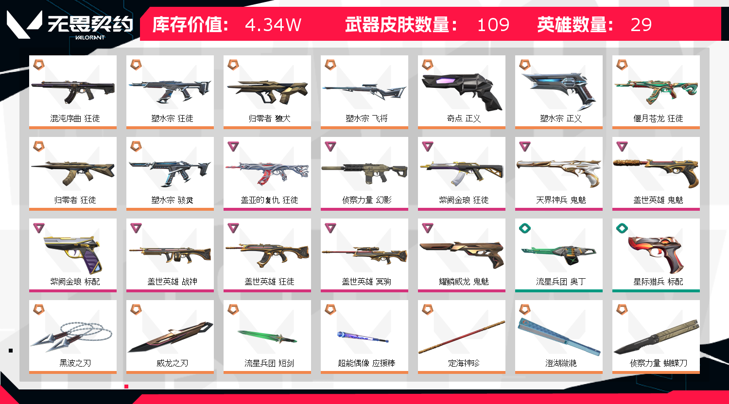 皮肤价值4w以上,文明使用,谢谢;黑波之刃,威龙之刃,归零者 獠犬,盖亚的复仇 狂徒,侦察力量 幻影,紫阙金琅 狂徒,混沌序曲 狂徒,