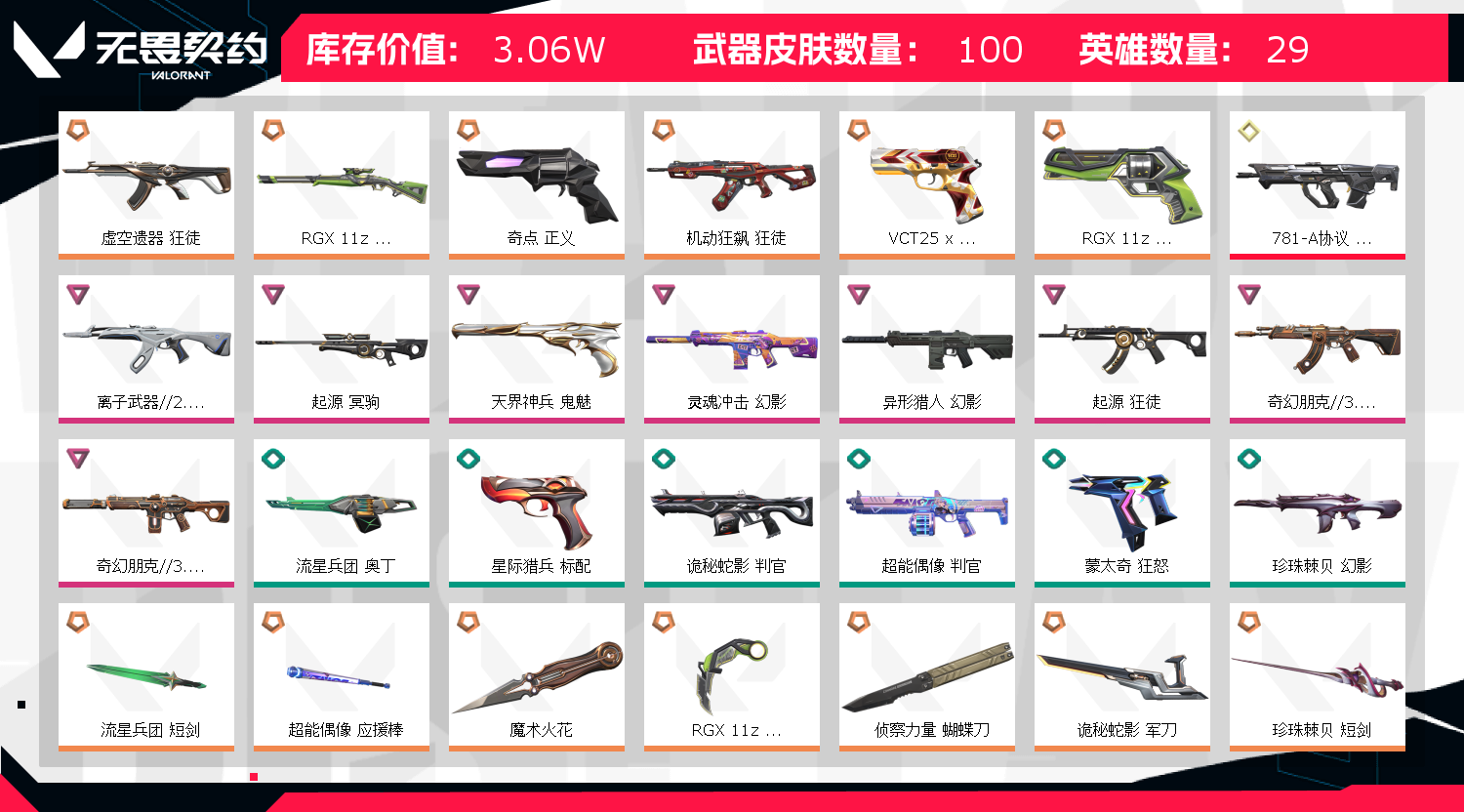 郑重声明:(炸鱼轻点炸,号封禁拉黑) !!因无畏契约检测严格,为防止后台插件导致封号,请务必重 启电脑!本人商户多年,所属账号已在派出所备案,若出现账号封禁/毁号等情况,会马上与平台联系,平台会报警处理!请租 客文明游戏,不要开挂或挂机 1.请勿使用第三方软件/插件/外挂,平台检测到会直接完单。2.登陆界面稍等2分钟会上去(自动登录)老板不要着急,一次不行多来几次wegame界面要耐心等2分钟 3..密令会自动输入如果一次不成功多来几次 4.请及时续租不要挂机,到时不下线,但是下一个会挤号导致挂机,所以请及时续租,导致禁赛的一律拉黑 5.祝老板玩的愉快,喜欢可以收藏关注!开挂必追究,不拿到赔 偿不罢休!如果上号正在游戏中,是上个租客到时不下线导致的,不是顶号,请帮忙打完这局,谢谢了。时间到了建议续租,打完撤单,为了防止顶号,请您及时续租,获得更好的游戏体验。;虚空遗器 狂徒,离子武器//2.0 狂徒,起源 冥驹,RGX 11z Pro//3.0 莽侠,天界神兵 鬼魅,奇点 正义,