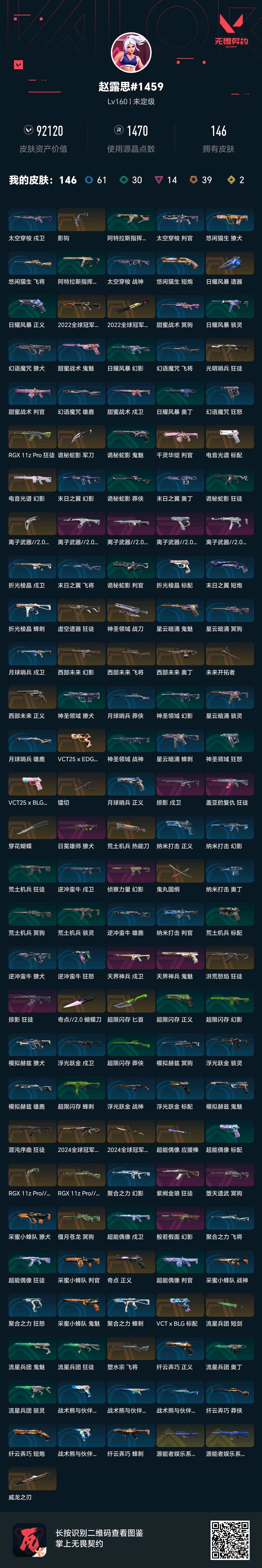 9.9w库存,22,24,25冠军套,离子2.0,边陲套。当前段位铂金1,可排位