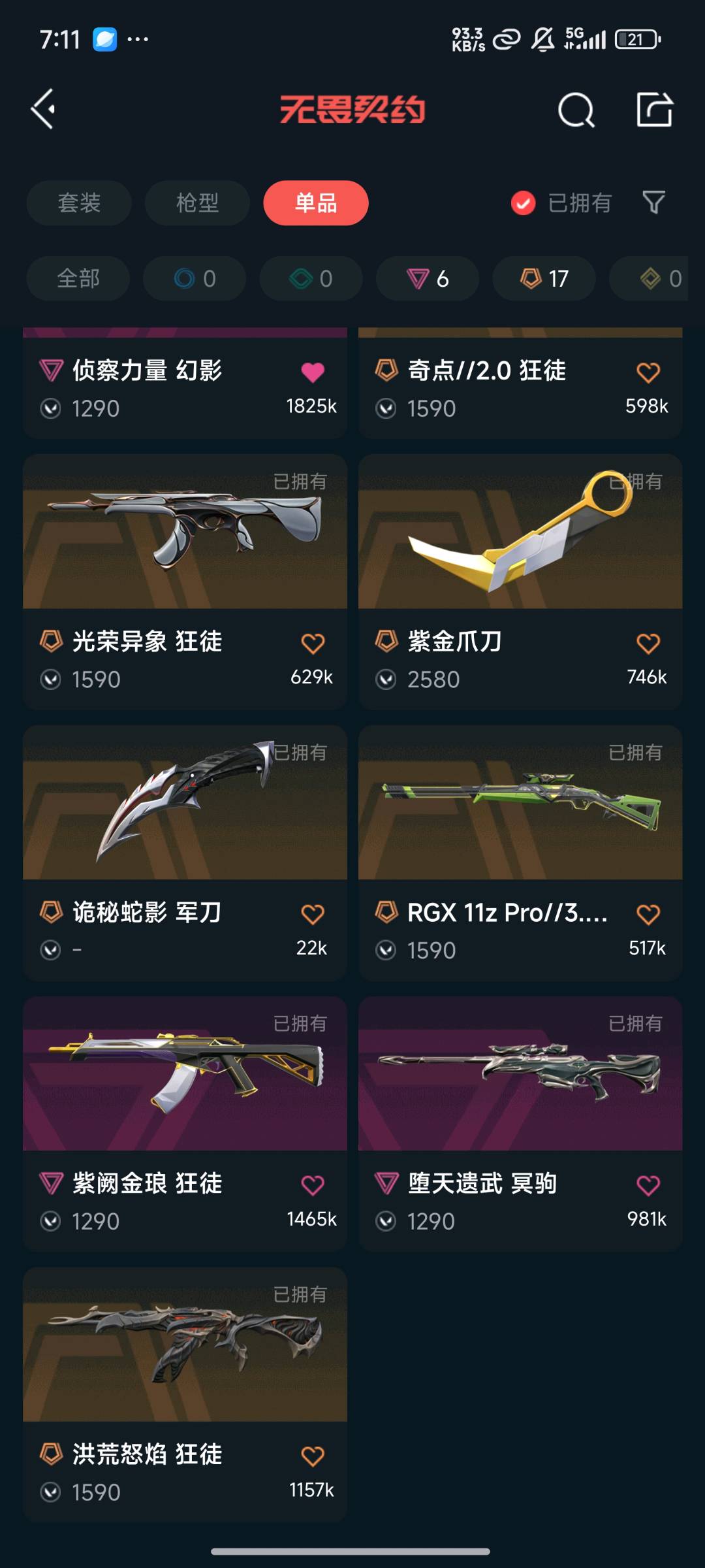 精品皮肤;紫金爪刀,盖亚的复仇 狂徒,洪荒怒焰 狂徒,侦察力量 幻影,紫阙金琅 狂徒,RGX 11z Pro 狂徒,光荣异象 狂徒,