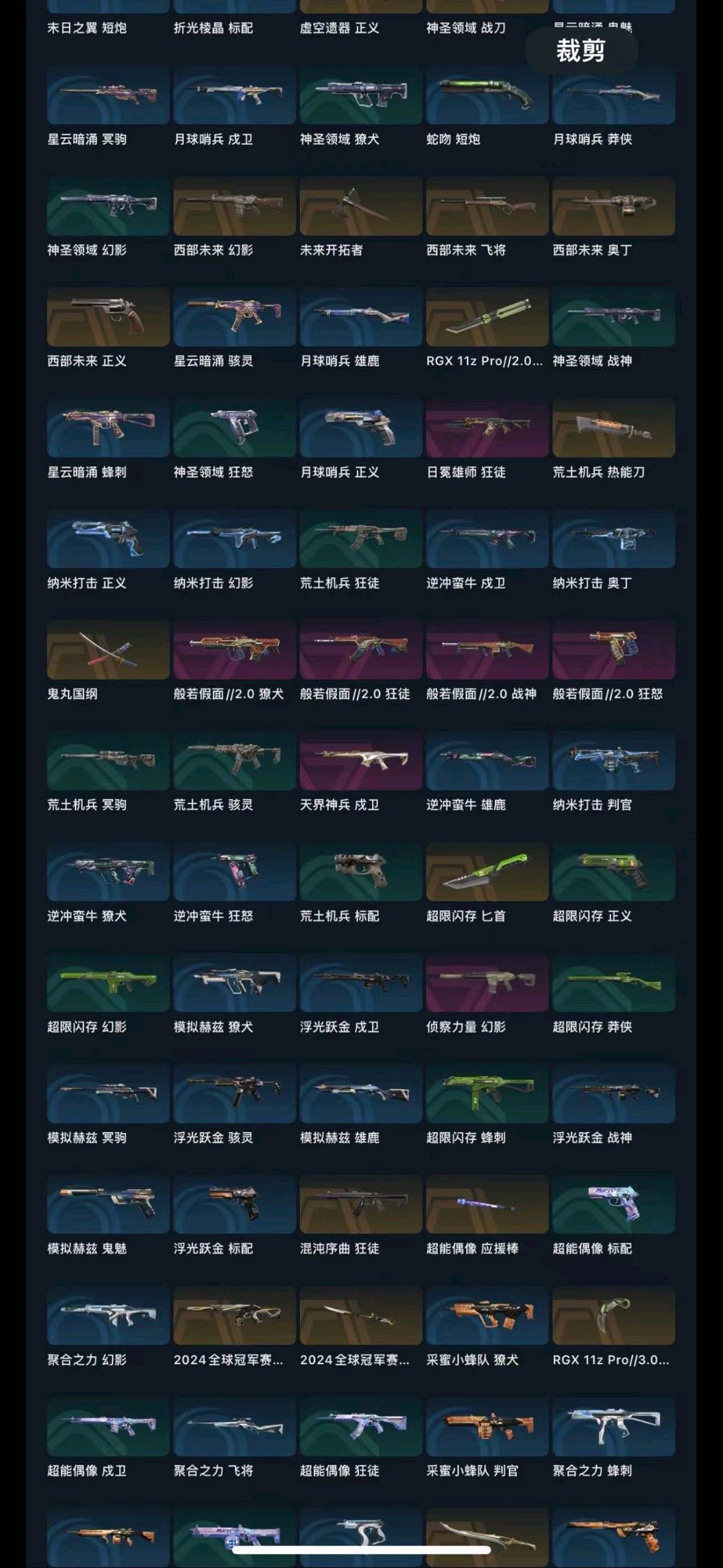 【拥有手枪】VCT-x-PRX-标配,电音光谱-标配,虚空遗器-正义,千灵华绽-正义,光明哨兵//2.0-短炮,奇点-正义,天界神兵-鬼魅,日耀风暴-正义,诡秘蛇影-鬼魅,神圣领域-狂怒,荒土机兵-标配,超限闪存-正义,超能偶像-标配,流星兵团-鬼魅,珍珠棘贝-狂怒,钢轨卫士-短炮,钢轨卫士-狂怒,沙尘幻旅-正义,弧光异彩-短炮,太空穿梭-正义,悠闲猫生-短炮,甜蜜战术-鬼魅,幻语魔咒-狂怒,游戏结束-正义,末日之翼-短炮,折光棱晶-标配,星云暗涌-鬼魅,蛇吻-短炮,月球哨兵-正义,逆冲蛮牛-狂怒,模拟赫兹-鬼魅,浮光跃金-标配,聚合之力-狂怒,采蜜小蜂队-鬼魅,灵魂消声者-鬼魅,纤云弄巧-正义,战术熊与伙伴们-标配,纤云弄巧-短炮,战术熊与伙伴们-狂怒,复古浪潮-正义,深海水族-短炮,光导纤维-鬼魅,梦魇恶魔-短炮,光导纤维-标配,萌彩剪影-狂怒,胡桃狂想-鬼魅,信手涂鸦-鬼魅,彩梦之城-标配,数码咒术-鬼魅,;西部未来 奥丁,紫金爪刀,威龙之刃,盖亚的复仇 狂徒,洪荒怒焰 狂徒,源能者娱乐系统 幻影,侦察力量 幻影,