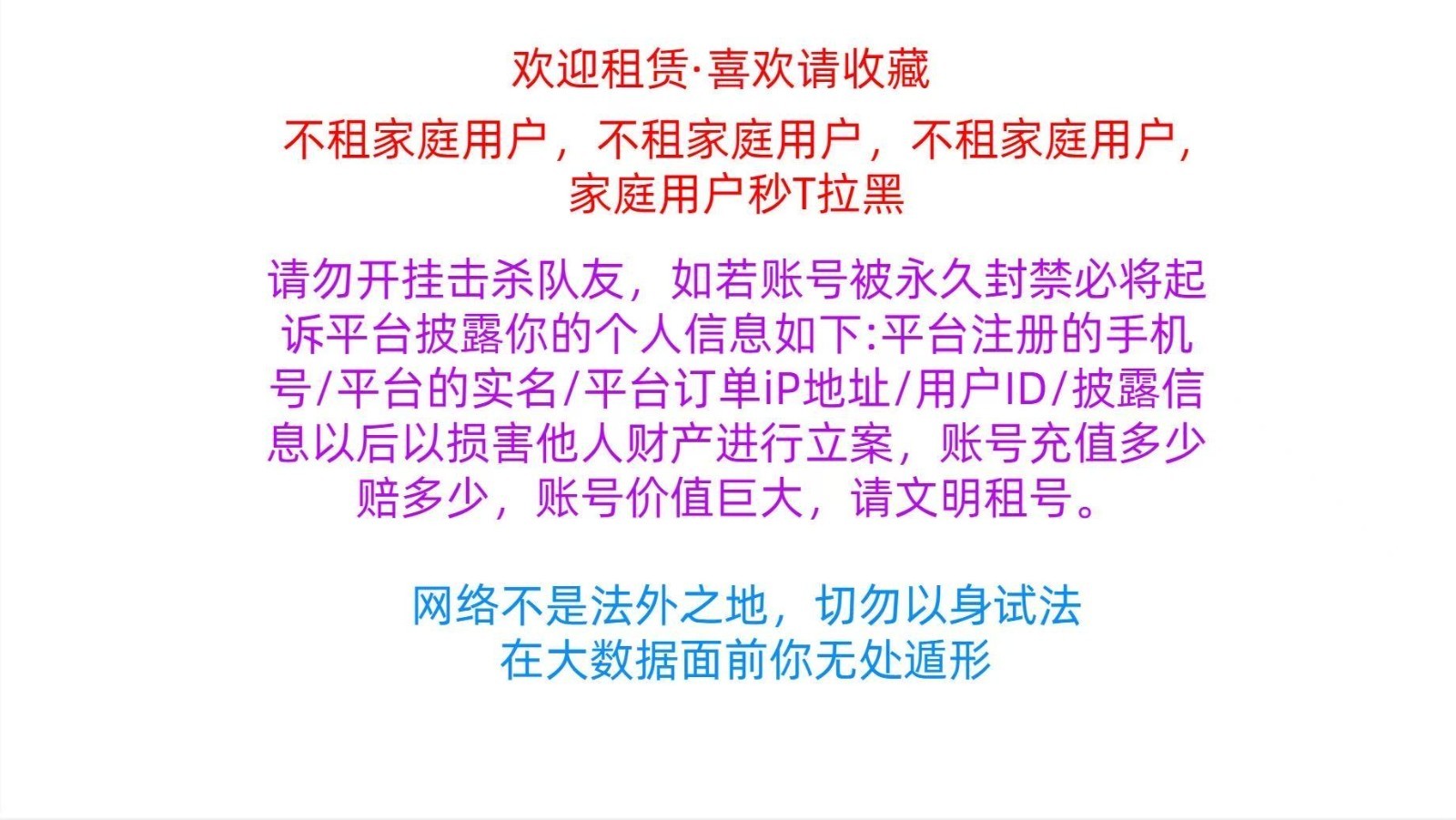 • 温馨提示:禁止使用外挂否则将扣除全部租金和押金,该信息由网络用户发布并对内容负责,GG租号仅是信息发布平台