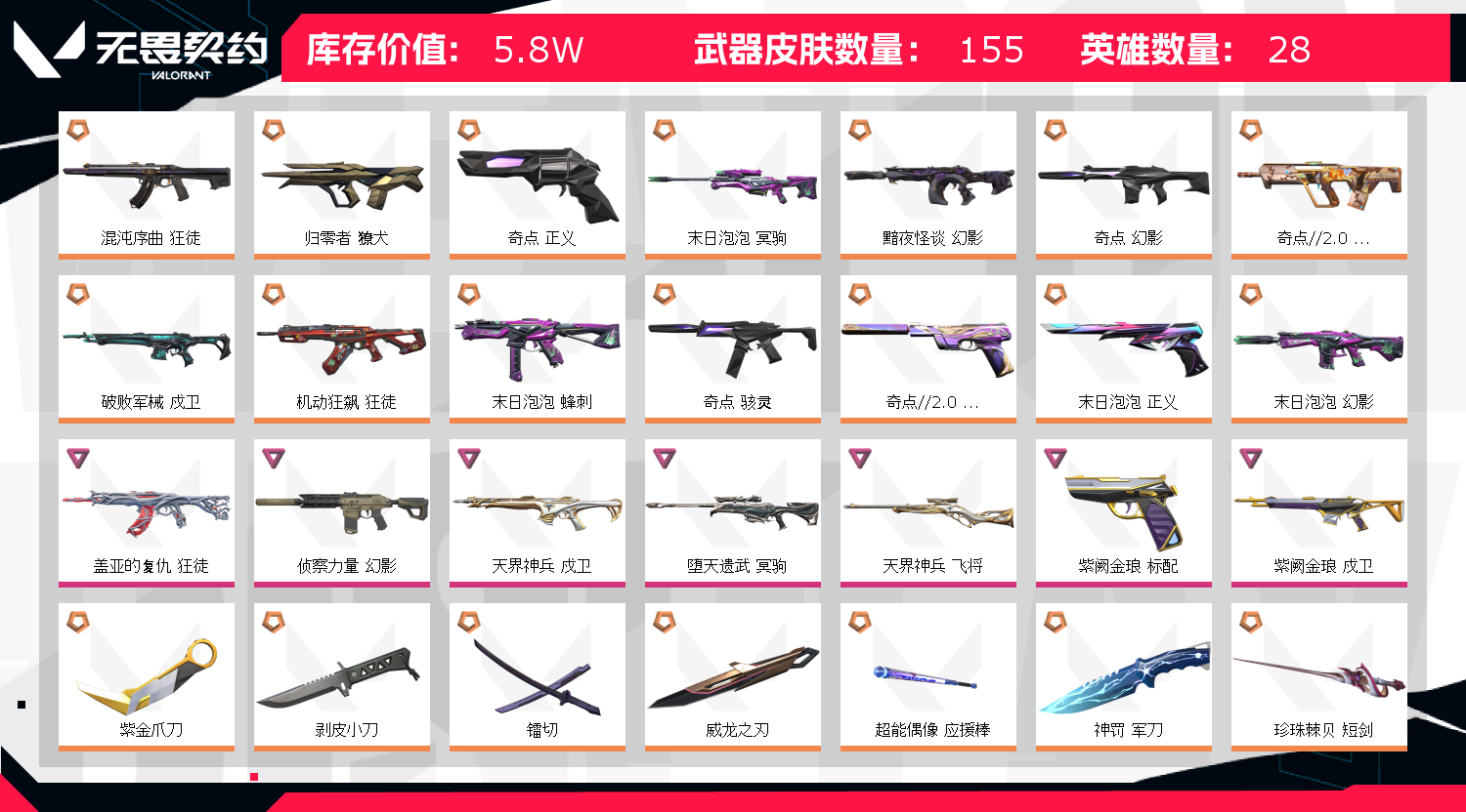 ✨冻结无法上号看wegame个人信息✨ 神话挂坠x4 超凡挂坠x2 【拥有套装】末日泡泡套装(末日泡泡-幻影,末日泡泡-冥驹,末日泡泡-蜂刺,末日泡泡-正义,泡泡电锯)奇点2.0套装(奇点//2.0-狂徒,奇点//2.0-鬼魅,奇点//2.0-蝴蝶刀)耀鳞威龙套装(耀鳞威龙-狂徒,耀鳞威龙-鬼魅,威龙之刃) 【拥有近战武器】神圣领域-战刀,荒土机兵-热能刀,超限闪存-匕首,超能偶像-应援棒,珍珠棘贝-短剑,钢轨卫士-战锤,沙尘幻旅-匕首,弧光异彩-军刀,神罚-军刀,镭切,紫金爪刀,天玄刀,剥皮小刀 【拥有步枪】混沌序曲-狂徒,黯夜怪谈-幻影,破败军械-戍卫,机动狂飙-狂徒,归零者-獠犬,奇点-幻影,天界神兵-戍卫,盖亚的复仇-狂徒,侦察力量-幻影,神圣领域-獠犬,神圣领域-幻影,荒土机兵-狂徒,超限闪存-幻影,超能偶像-戍卫,超能偶像-狂徒,珍珠棘贝-幻影,珍珠棘贝-戍卫,钢轨卫士-狂徒,钢轨卫士-戍卫,沙尘幻旅-狂徒,噬源兽防卫工程-幻影,弧光异彩-獠犬,弧光异彩-狂徒,月球哨兵-戍卫,纳米-幻影,逆冲蛮牛-戍卫,逆冲蛮牛-獠犬,模拟赫兹-獠犬,浮光跃金-戍卫,采蜜小蜂队-獠犬,聚合之力-幻影,复古浪潮-獠犬,战术小伙伴-獠犬,战术小伙伴-幻影,胡桃狂想-獠犬,萌彩剪影-戍卫,彩梦之城-戍卫,数码咒术-獠犬 【拥有狙击枪】堕天遗武-冥驹,天界神兵-飞将,盖世英雄-冥驹,荒土机兵-冥驹,超限闪存-莽侠,沙尘幻旅-飞将,合金战车-飞将,星云暗涌-冥驹,月球哨兵-莽侠,模拟赫兹-冥驹,聚合之力-飞将,深海水族-莽侠,复古浪潮-冥驹,光导纤维-飞将,沙场老兵-冥驹,胡桃狂想-冥驹,信手涂鸦-飞将,花漾粉红-冥驹 【拥有机枪】神圣领域-战神,纳米-奥丁,浮光跃金-战神,采蜜小蜂队-战神,深海水族-战神,战术小伙伴-奥丁,萌彩剪影-战神,信手涂鸦-奥丁,数码咒术-战神 【拥有冲锋枪】奇点-骇灵,荒土机兵-骇灵,超限闪存-蜂刺,珍珠棘贝-骇灵,沙尘幻旅-骇灵,弧光异彩-蜂刺,合金战车-蜂刺,星云暗涌-蜂刺,星云暗涌-骇灵,浮光跃金-骇灵,聚合之力-蜂刺,深海水族-蜂刺,光导纤维-骇灵,战术小伙伴-蜂刺,胡桃狂想-蜂刺,信手涂鸦-骇灵,花漾粉红-骇灵 【拥有霰弹枪】超能偶像-判官,月球哨兵-雄鹿,逆冲蛮牛-雄鹿,纳米-判官,模拟赫兹-雄鹿,采蜜小蜂队-判官,复古浪潮-雄鹿,萌彩剪影-判官,彩梦之城-雄鹿,数码咒术-判官 【拥有手枪】奇点-正义,紫阙金琅-标配,阿特拉斯指挥部-标配,日耀风暴-正义,诡秘蛇影-鬼魅,神圣领域-狂怒,荒土机兵-标配,超限闪存-正义,超能偶像-标配,流星兵团-鬼魅,珍珠棘贝-狂怒,钢轨卫士-狂怒,钢轨卫士-短炮,沙尘幻旅-正义,弧光异彩-短炮,合金战车-正义,月球哨兵-正义,星云暗涌-鬼魅,纳米-正义,逆冲蛮牛-狂怒,浮光跃金-标配,模拟赫兹-鬼魅,聚合之力-狂怒,采蜜小蜂队-鬼魅,复古浪潮-正义,深海水族-短炮,光导纤维-鬼魅,光导纤维-标配,灵魂消声者-鬼魅,萌彩剪影-狂怒,胡桃狂想-鬼魅,彩梦之城-标配,信手涂鸦-鬼魅,花漾粉红-狂怒 【稀有挂件】V25第三幕神话挂饰,第九季神话挂饰;紫金爪刀,剥皮小刀,镭切,威龙之刃,归零者 獠犬,盖亚的复仇 狂徒,侦察力量 幻影,