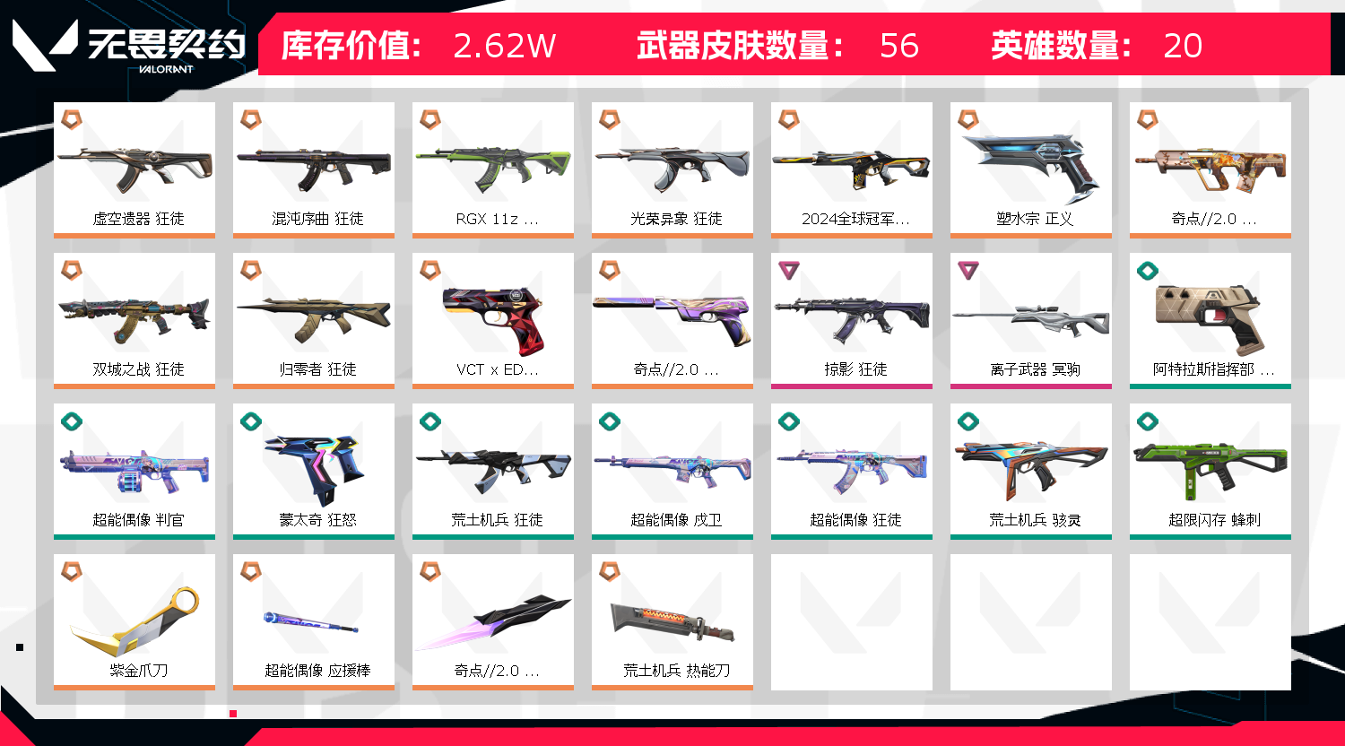 你好;紫金爪刀,虚空遗器 狂徒,掠影 狂徒,RGX 11z Pro 狂徒,混沌序曲 狂徒,光荣异象 狂徒,2024全球冠军赛 幻影,