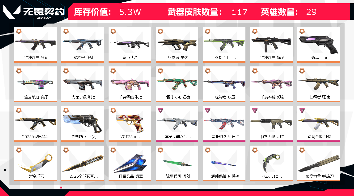 首页 > 租号大厅 > 无畏契约-wegame > wegame/wegame > 包天特惠✅可排位✅5.3万库存114皮✅25冠军套,紫金,盖亚,混沌,侦查m4,紫金爪刀,离子狙