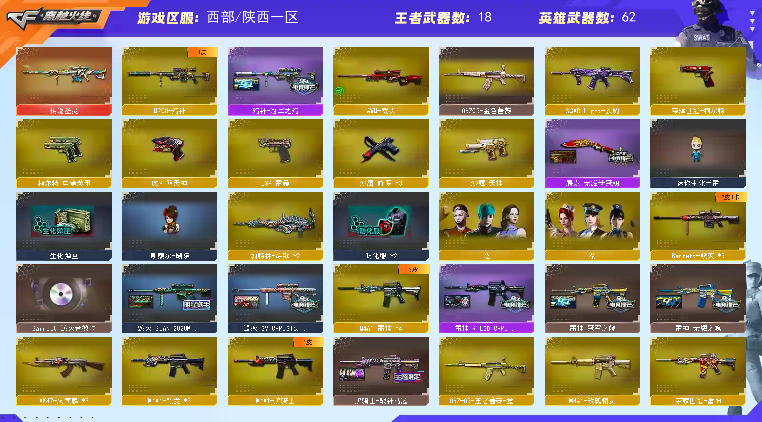 【★传说圣灵★】【m200-幻神 带冠军之幻皮肤】【scar light-玄豹】【usp-雷暴】【qbz-金色蔷薇】狙击呛:【传说圣灵】【m200-幻神】【barrett-毁灭×2】【awm-裁决】【awm-天龙】【barrett-暗月传说×2】步呛:【qbz-金色蔷薇】【scar light-玄豹】【m4a1-雷神×4】【荣耀世冠-雷神】【m4a1-黑龙×2】【王者之势--王者火魄--qbz-王者蔷薇】机呛:【加特林-炼狱】生化武器:【传说圣灵】【m200-幻神】【scar light-玄豹】挑战强化武器:【awm-裁决】手呛:【usp-雷暴】【cop-堕天神】【荣耀世冠-柯尔特】【柯尔特-电竞装甲】【刀具:屠龙 龙啸 擎天 斩神刀-雷暴 幻灵之锋 荣耀世冠-龙啸】【手雷:雷暴手雷套×4 电竞装甲手雷套 幻灵手雷套 雷霆王者手雷套 雷暴闪光丹手雷套×4】【音效卡:毁灭音效卡】角色:【炫 芳心审判者 灵狐者-黄金海岸 龙儿-小淘气 潘多拉-x 职业选手】皮肤:【幻神-冠军之幻 雷神-荣耀之魄 雷神-冠军之魄 雷神-r.lgd-cfpls18冠军 屠龙-荣耀世冠ag 毁灭-ag-cfpls15冠军 毁灭-bean-2020mvp 毁灭-sv-cfpls16冠军 火麒麟-cf-star 火麒麟-ag战队×2 黑骑士-白马银呛 】;USP-雷暴,荣耀世冠-柯尔特,QBZ03-金色蔷薇,M200-幻神,