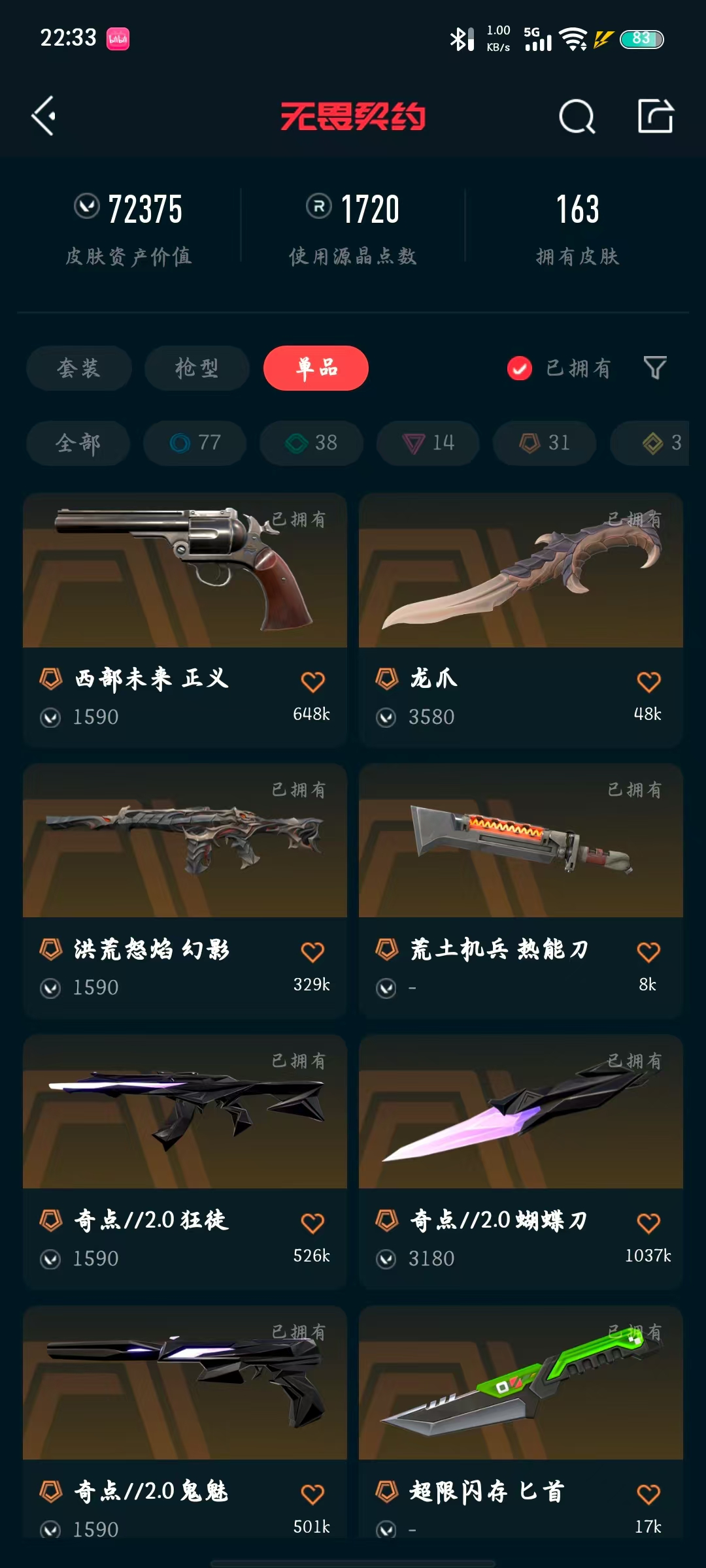 冻结秒解✨可排✨7.2w价值✨奇点全套✨离火刃✨显卡爪刀✨塑水宗狂徒✨威龙之刃✨侦察蝴蝶✨