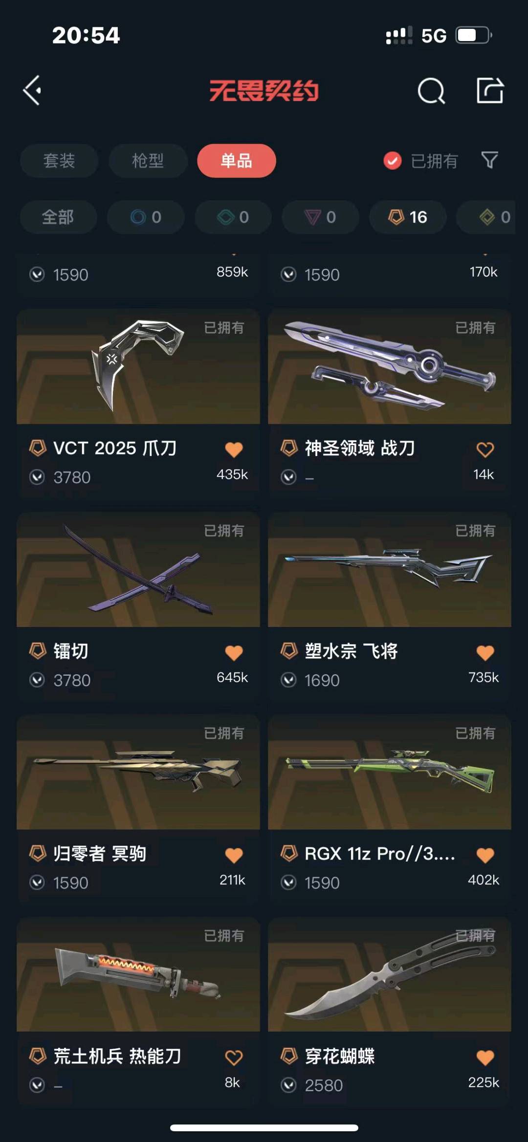 日冕雄师 狂徒、掠影 正义、天界神兵 戍卫、侦察力量 幻影、盖亚的复仇 狂徒、千灵华绽 正义、RGX 11z Pro 狂徒、黯夜怪谈 幻影、洪荒怒焰 狂徒、虚空遗器 狂徒 VCT 2025 爪刀、神圣领域 战刀、镭切、塑水宗 飞将、归零者 冥驹、RGX 11z Pro、荒土机兵 热能刀、穿花蝴蝶、威龙之刃、日耀风暴 遗器、诡秘蛇影 军刀;镭切,威龙之刃,VCT 2025 爪刀,盖亚的复仇 狂徒,虚空遗器 狂徒,洪荒怒焰 狂徒,侦察力量 幻影,