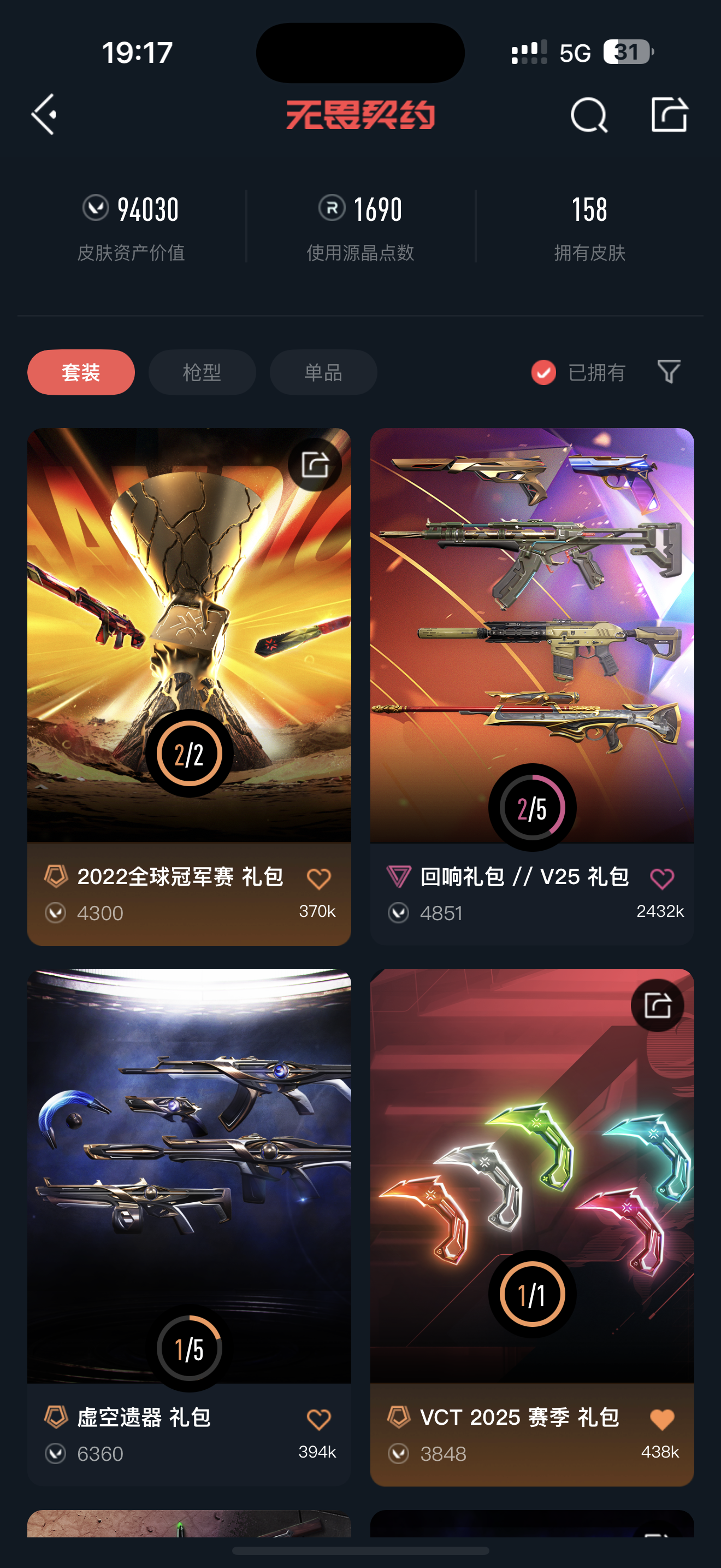 9.4万库存♥22冠军套♥vct爪刀♥创纪元套♥混沌序曲套♥塑水宗套♥盖亚之愠♥归零狂徒