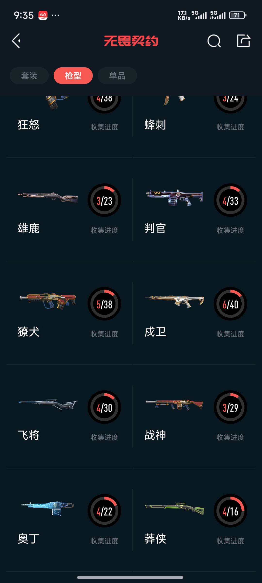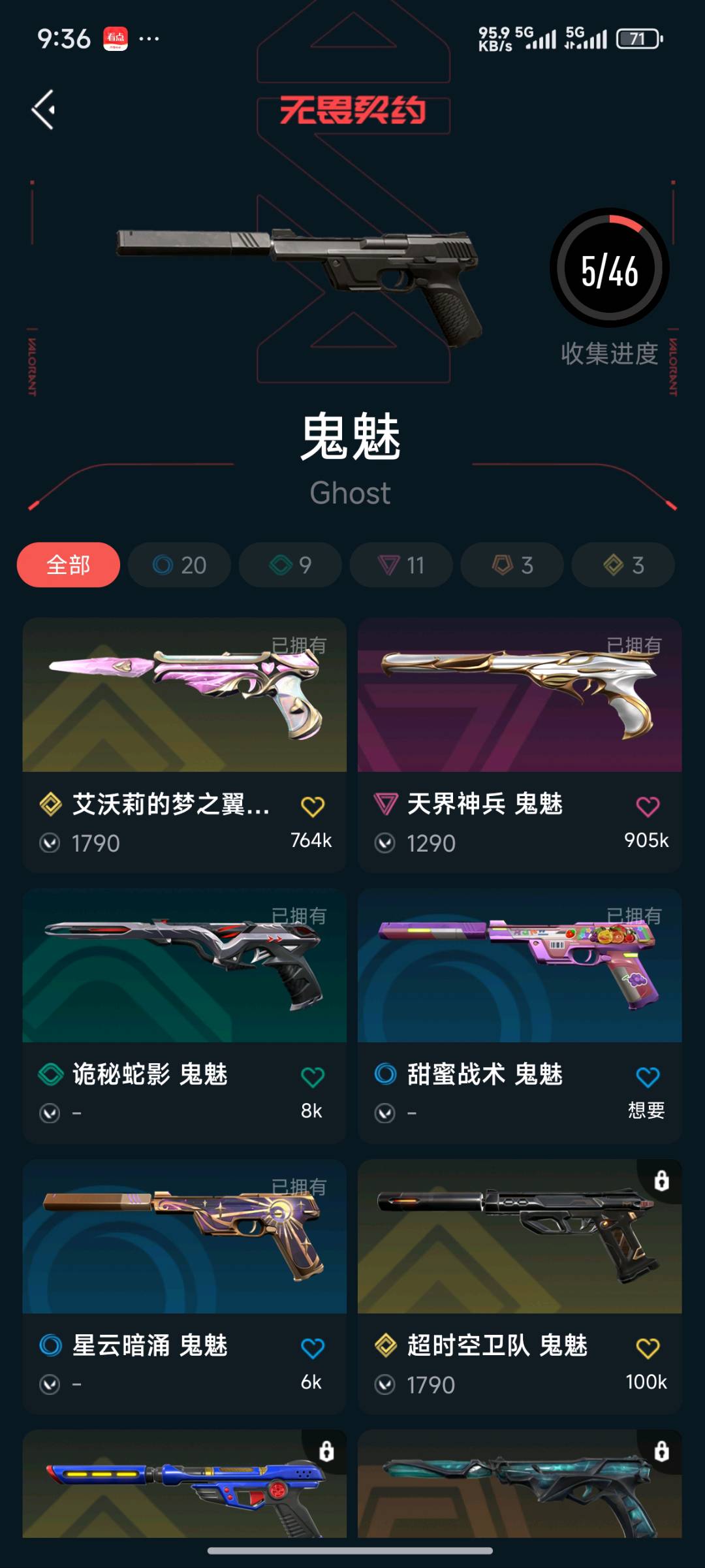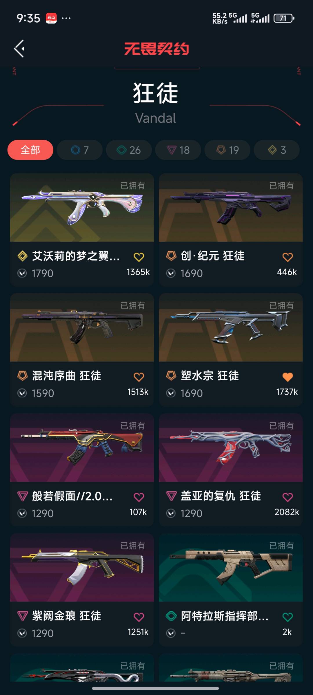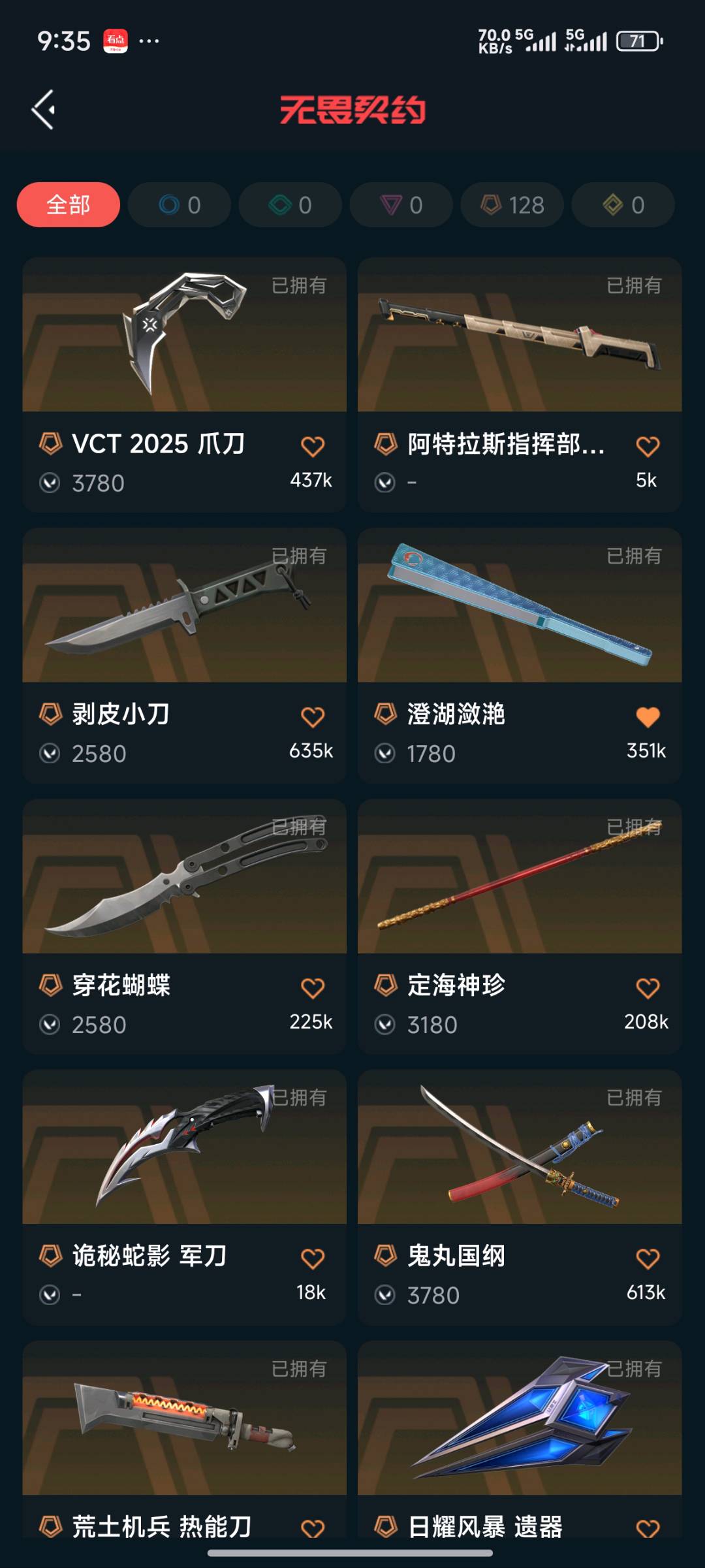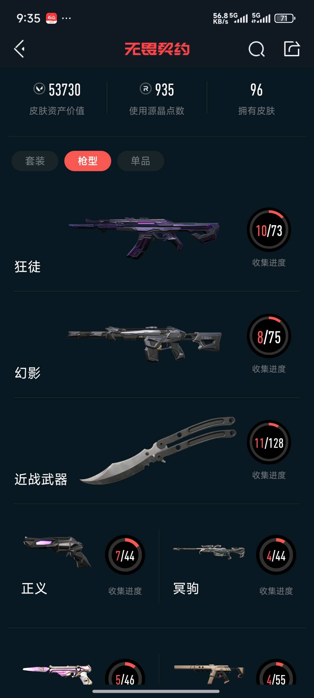 可排位 英雄27 武器皮肤数量96;剥皮小刀,VCT 2025 爪刀,盖亚的复仇 狂徒,紫阙金琅 狂徒,天界神兵 戍卫,混沌序曲 狂徒,塑水宗 狂徒,