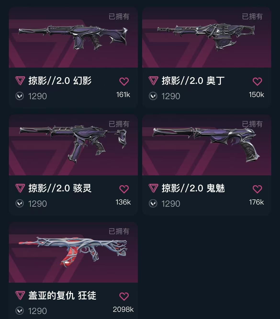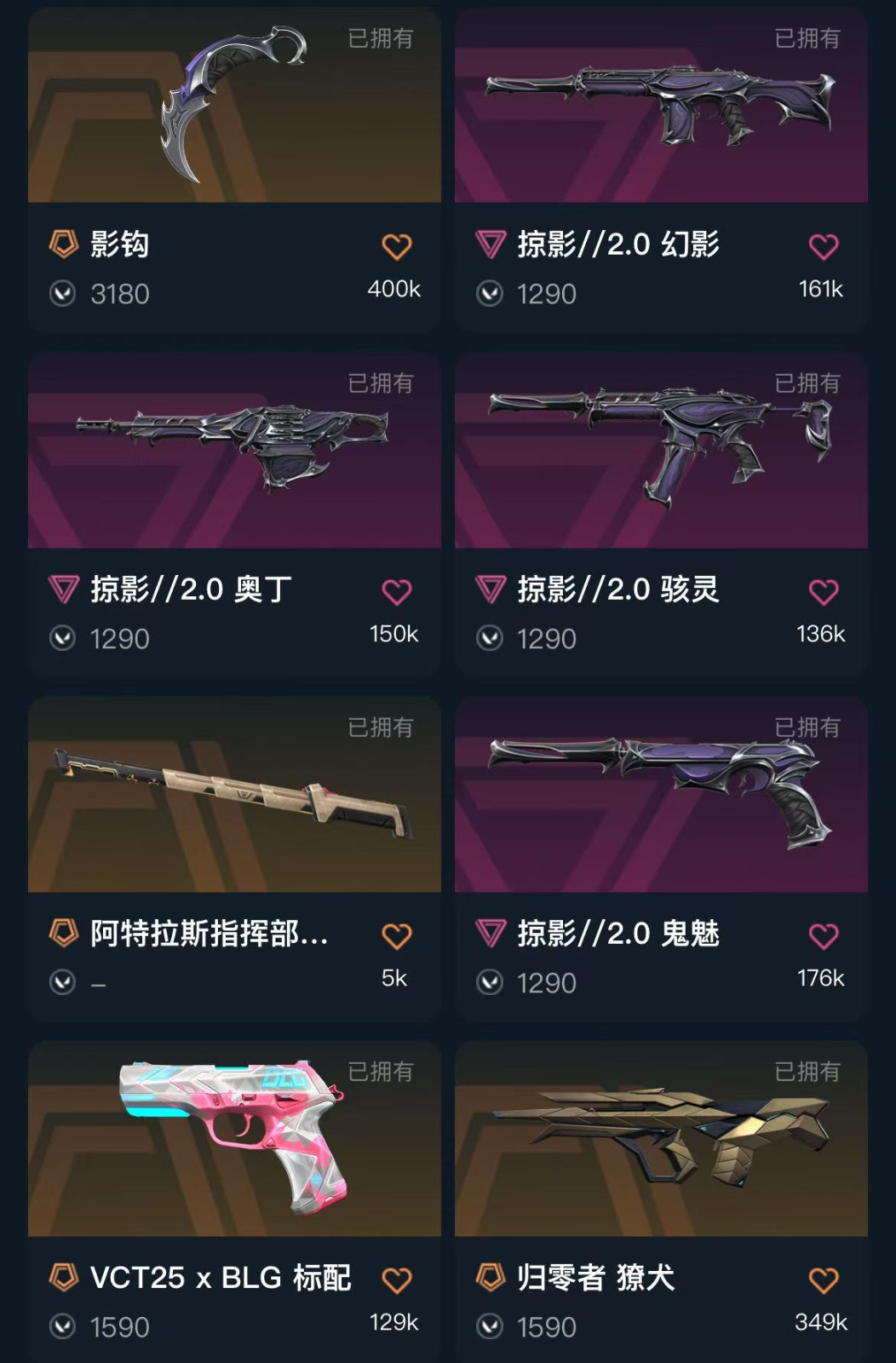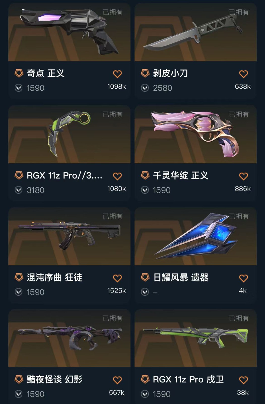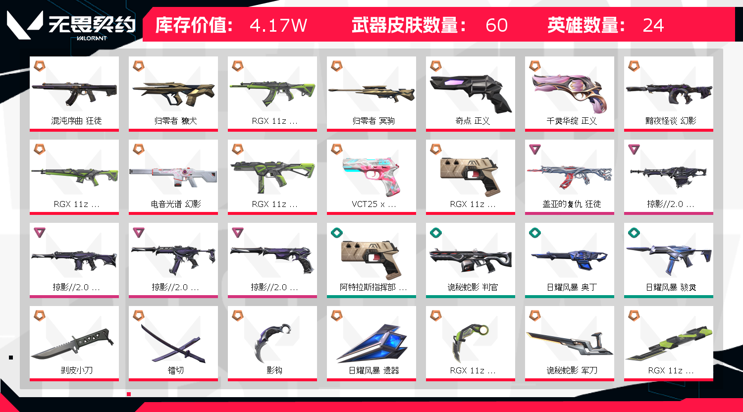 可排位 英雄19 武器皮肤数量60;剥皮小刀,镭切,归零者 獠犬,盖亚的复仇 狂徒,RGX 11z Pro 狂徒,混沌序曲 狂徒,归零者 冥驹,