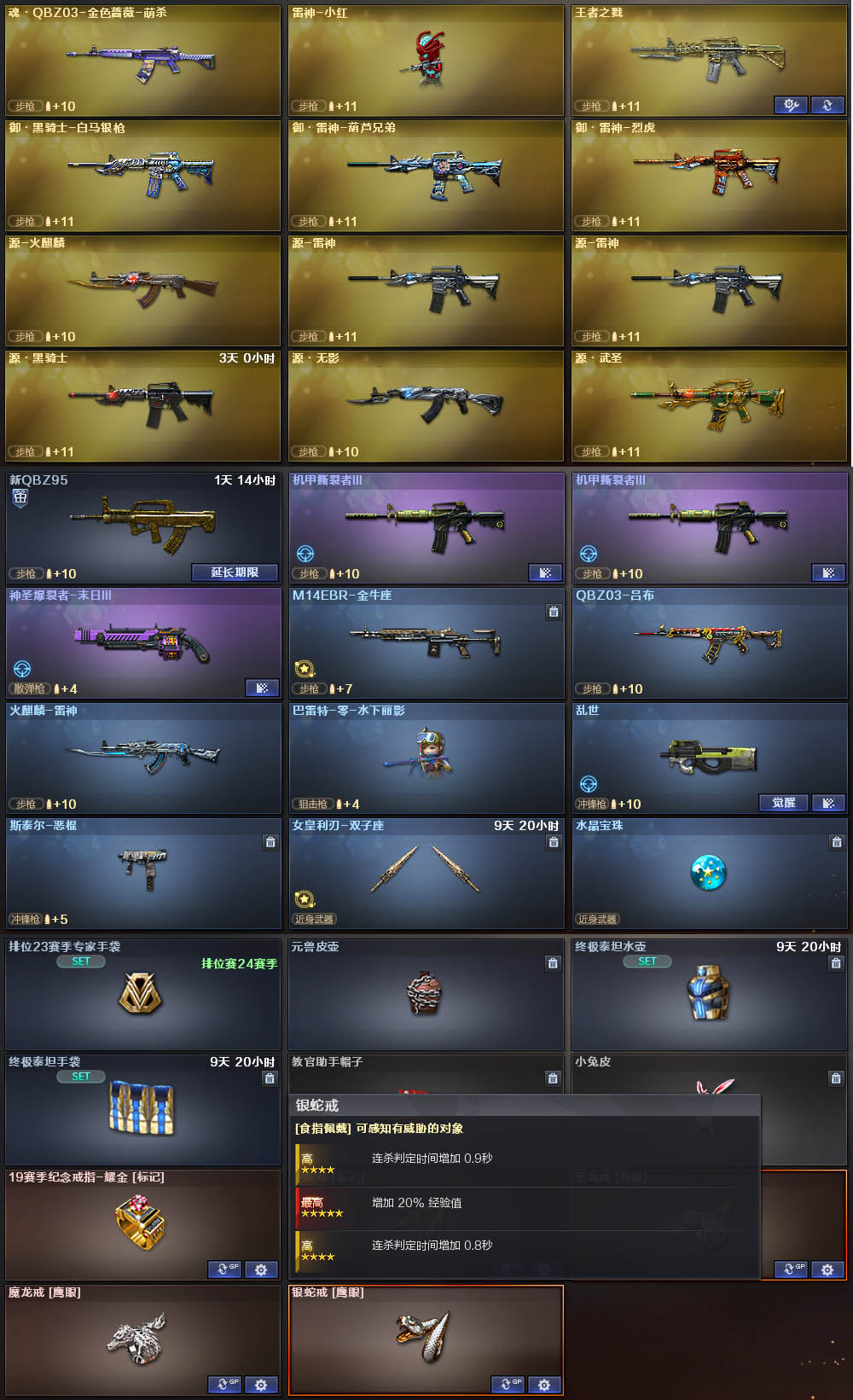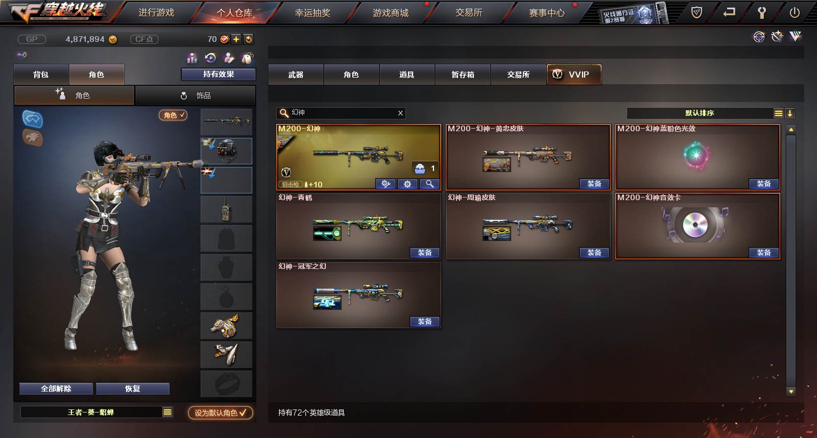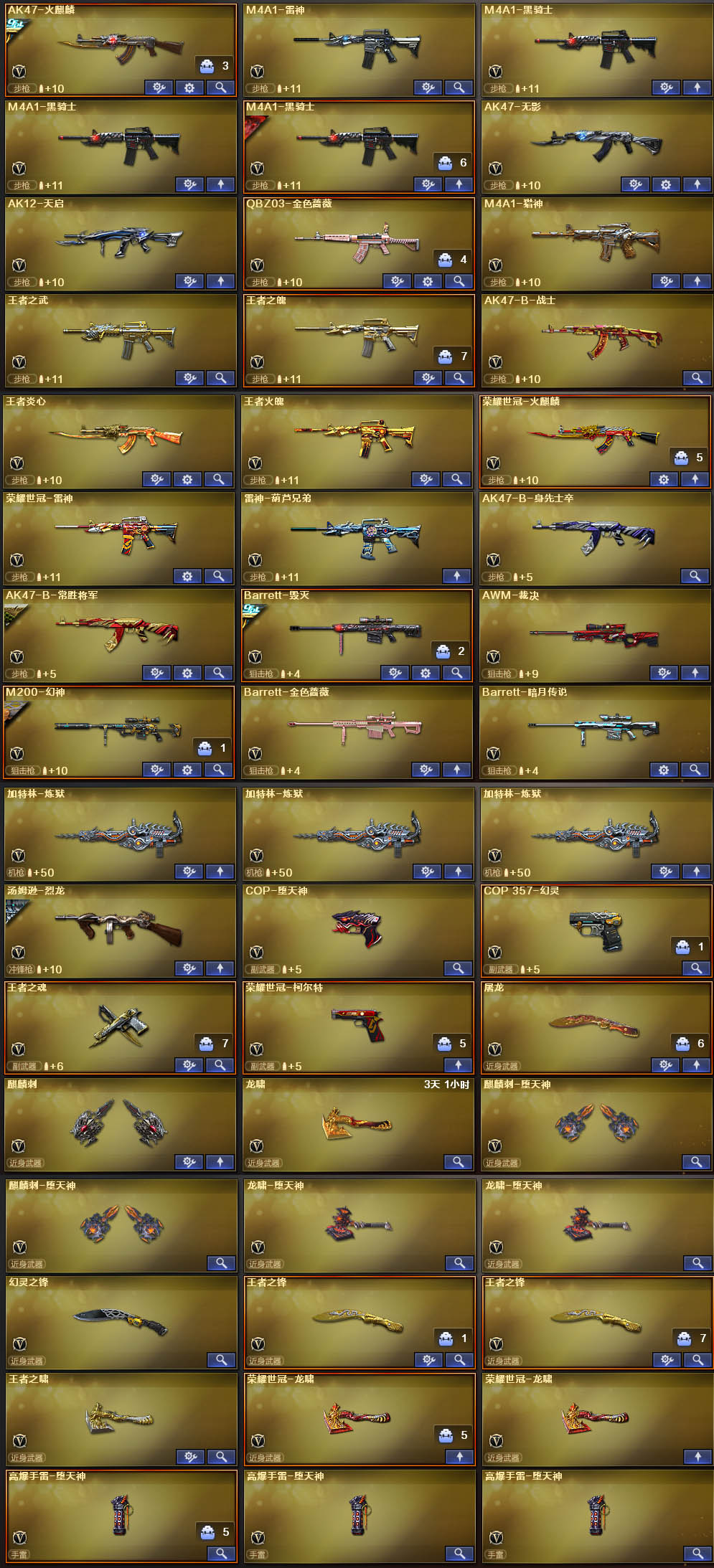幻神光效,世冠套,QBZ金色蔷薇,Bar金色蔷薇,COP堕天神,COP幻灵,王者之魂,王者之武,王者之魄,王者火魄,王者炎心,小红,水下丽影,四防貂蝉,四防小乔,4音效:火麒麟音效卡,毁灭音效卡,黑骑士音效卡,幻神音效卡,冠军之怒,轻羽皮肤,冠军之心,张飞,地狱火,STAR,星空等等详情看图。;荣耀世冠-柯尔特,QBZ03-金色蔷薇,M200-幻神,