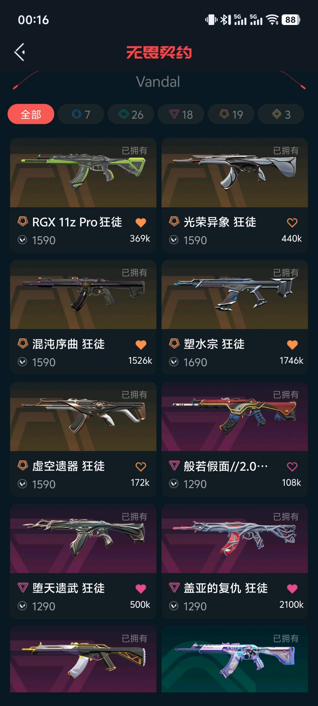 主战皮全,ak皮肤多;盖亚的复仇 狂徒,虚空遗器 狂徒,侦察力量 幻影,紫阙金琅 狂徒,RGX 11z Pro 狂徒,天界神兵 戍卫,堕天遗武 狂徒,
