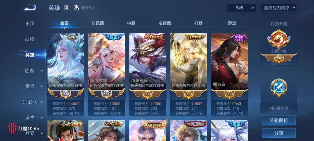 V10✨541皮✨95段打野双大国多热门小国✨国服露娜李白澜老虎满典藏