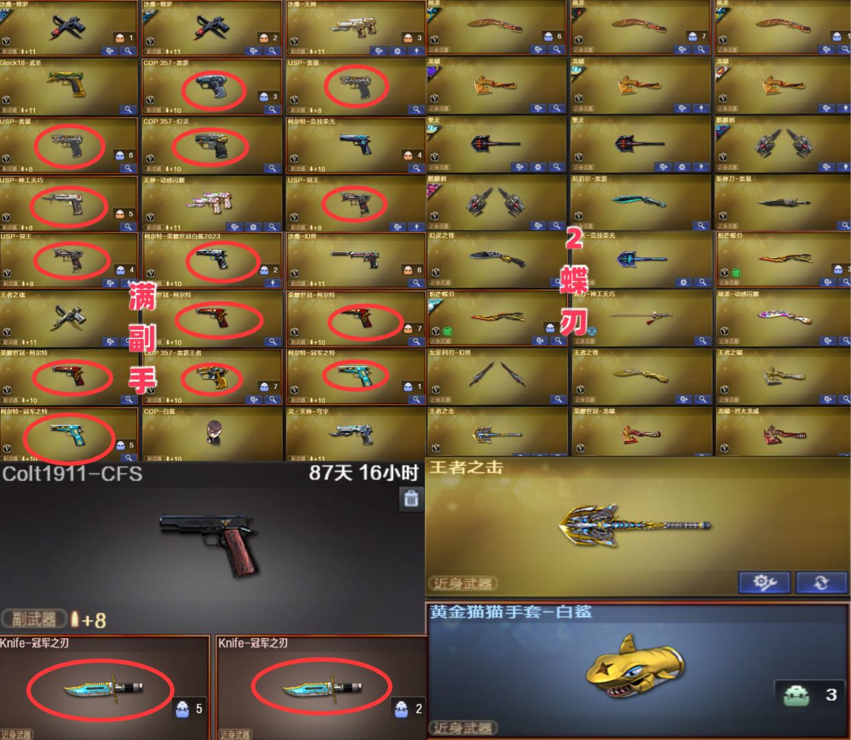 注意事项: A.游戏过程中请不要恶意挂机或者不文明发言 B.恶意挂机、顶号等行为将被拉黑无法再次下单 C.进入游戏后中途请勿退出登陆,否则无法再次上号 D.部分账号由于异地登录可能会出现密码错误提示,通常再尝试5-6次后可上号 |;USP-雷暴,USP-雷暴王者,荣耀世冠-柯尔特,柯尔特-荣耀世冠白鲨2023,柯尔特-冠军之特,Knife-冠军之刃,沙漠玫瑰,