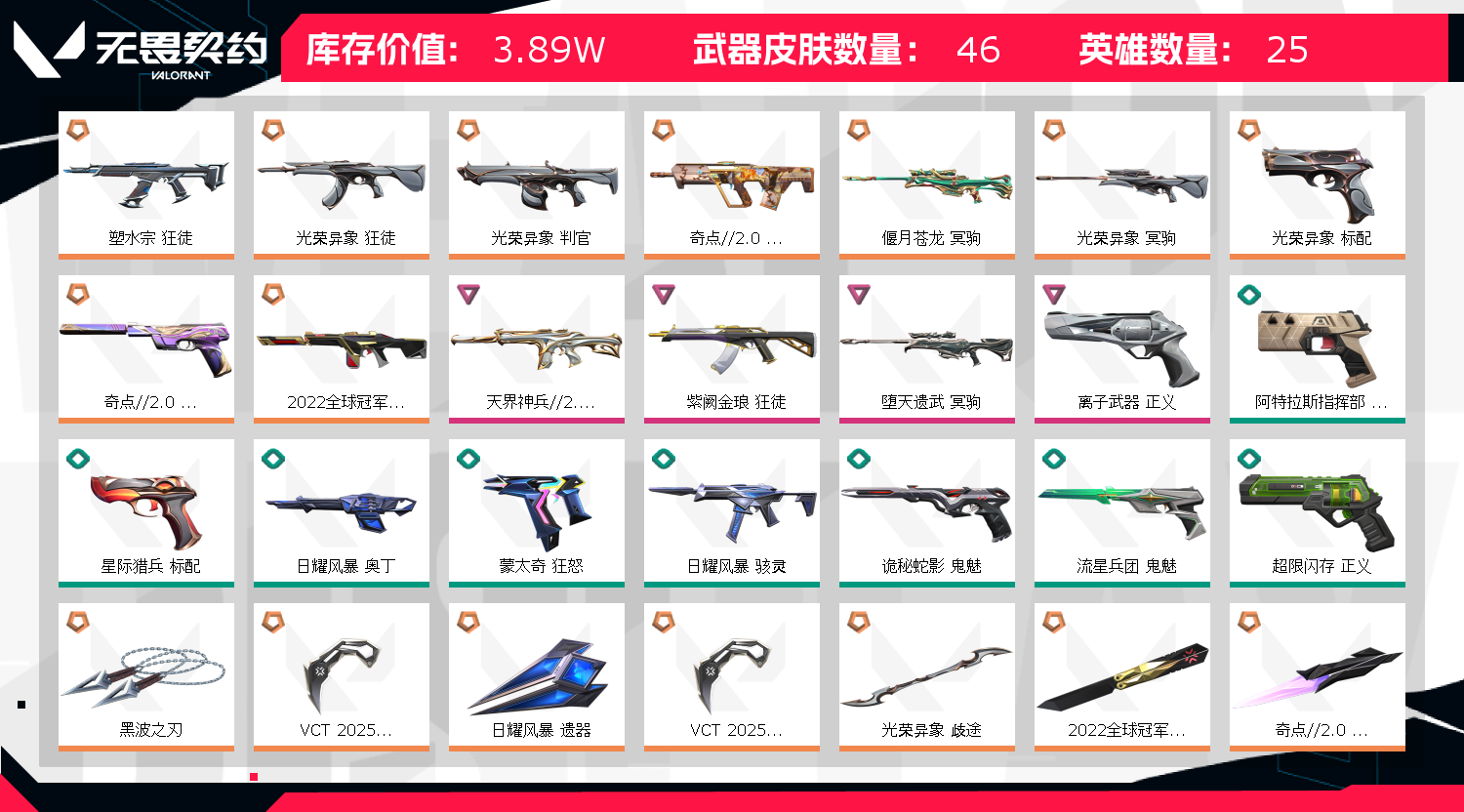 可排位/光荣异象/奇点2.0/VCT25爪刀/22年冠军全套装/塑水宗刀皮与ak/紫金龙年ak/天界神兵幻影/偃月苍龙/弃王大狙/禁止乱用R点与点券;黑波之刃,VCT 2025 爪刀,天界神兵//2.0 幻影,紫阙金琅 狂徒,塑水宗 狂徒,光荣异象 狂徒,堕天遗武 冥驹,