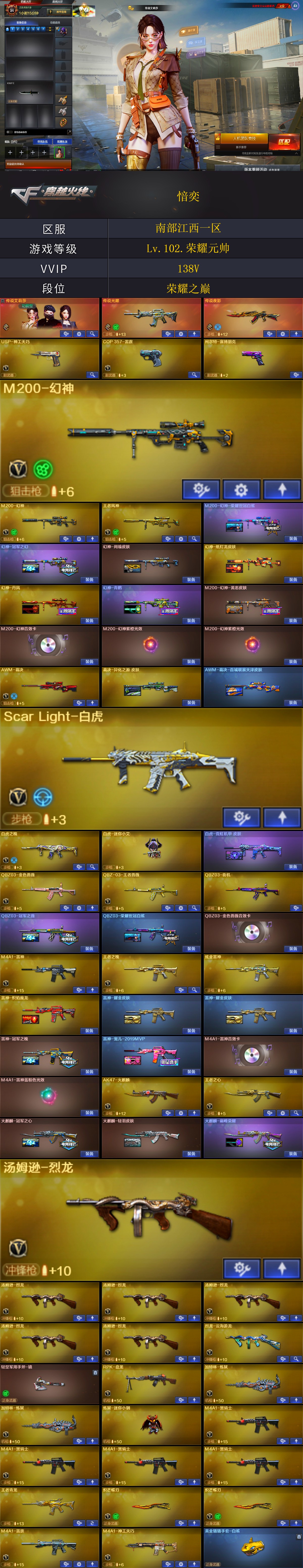 【稀有武器】:传说光耀/传说夜影/M200-幻神(2)/ScarLight-白虎/M4A1-神工天巧/M4A1-雷霆/雷霆之契/USP-神工天巧/天神-动感闪耀/QBZ03-金色蔷薇/AK47-火麒麟(2)/M4A1-黑龙(4)/M4A1-雷神(2)/M4A1-黑骑士(4)/AK47-无影/AK47-黑武士/Barrett-毁灭(3)/Barrett-极光/AWM-裁决/RPK-盘龙/加特林-炼狱(2)/汤姆逊-烈龙(6)/AA-12-雷霆/炽芒蝶刃(2) 【王者武器】:王者之心-觉醒版/王者之魄-觉醒版/QBZ-03-王者蔷薇-觉醒版/王者青龙/王者风势-觉醒版/白虎之魄-觉醒版/王者之怒-觉醒版/王者之光-觉醒版/王者之力-觉醒版/王者风神-觉醒版/王者青龙 【热门角色】:传说艾莉莎/关小雨/荒漠琉璃/机械姬/晴雅/司雨/雾萌萌/炫/隼/乔伊教练/王者-迷迭香/王者沙漠玫瑰/灵狐者-职业经理/潘多拉-X/兔囡囡/潘多拉 【热门音效卡】:M200-幻神音效卡/QBZ03-金色蔷薇音效卡/M4A1-雷神音效卡/Barrett-毁灭音效卡/M4A1-黑骑士音效卡/Barrett-极光音效卡 【热门皮肤】:M200-幻神-荣耀世冠白鲨/幻神-冠军之幻/幻神-周瑜皮肤/幻神-纸灯龙皮肤/幻神-丹凤/幻神-青鹤/裁决-异化之源皮肤/屠龙-星火燎原(2)/屠龙-荣耀世冠AG/擎天-冠军之击/火麒麟-巅峰荣耀/QBZ03-冠军之薇/白虎-霓虹机甲 皮肤/QBZ03-荣耀世冠白鲨/M4A1-战神赵云/雷神-宠儿-2019MVP/火麒麟-冠军之心/毁灭-冠军之怒/屠龙-春桃皮肤/雷神-冠军之魄 【其他亮点】:炼狱-迷你小钢/白虎-迷你小艾/金色蔷薇-空/柯尔特-赛博朋克/黄金猫猫手套-白鲨 (截图展示段位不代表实际段位,如赛季更新等不可抗拒因素发生变化,其余道具看截图或咨询客服);炽芒蝶刃,隼,晴雅,王者沙漠玫瑰,传说艾莉莎,RPK-盘龙,QBZ03-金色蔷薇,