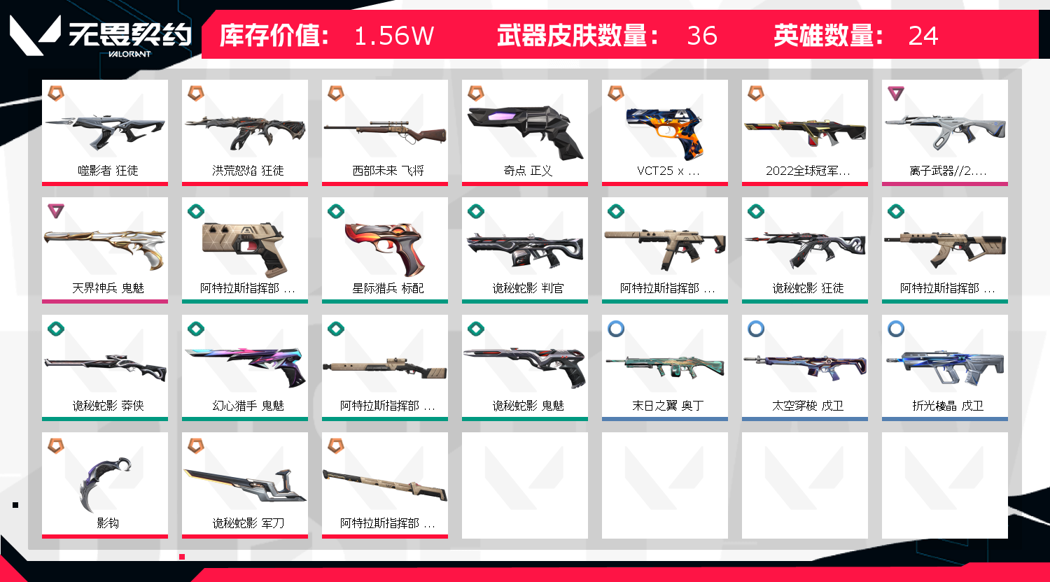 ❤️1.5w库存❤️影钩❤️22枪❤️洪荒狂徒❤️西部飞将❤️噬影狂徒❤️奇点正义❤️诡秘刀❤️;洪荒怒焰 狂徒,噬影者 狂徒,离子武器//2.0 狂徒,西部未来 飞将,天界神兵 鬼魅,奇点 正义,