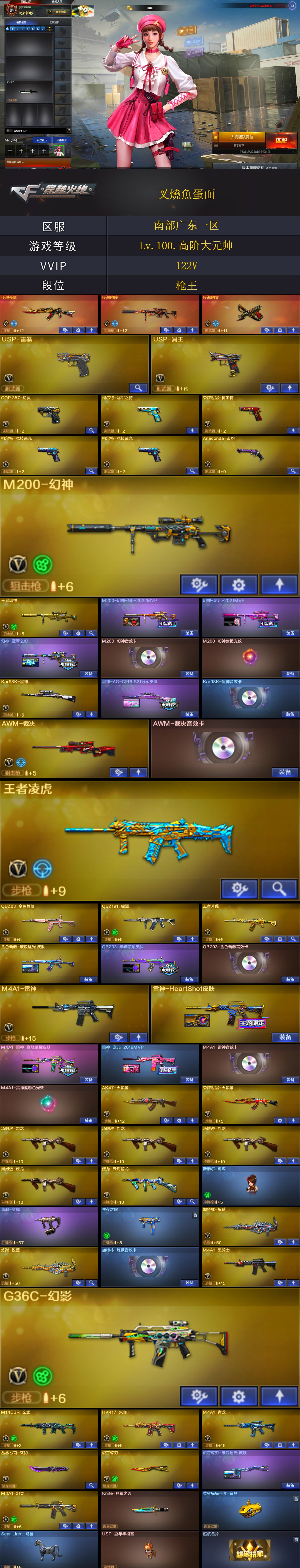 【商品标题】:南部广东一区-122V-可二次实名-【Lv.100.高阶大元帅】-【段位:枪王】 【稀有武器】:传说夜影/传说幽瞳/传说幽冥/M200-幻神/Kar98K-星神/G36C-幻影/M14EBR-玄武/M4A1-青龙/HK417-朱雀/M4A1-幻灵/USP-雷暴/COP357-幻灵/柯尔特-竞技荣光(2)/修罗-古蛇迷踪/荣耀世冠-柯尔特/柯尔特-冠军之特/金色蔷薇-古蛇迷踪/QBZ03-金色蔷薇/AK47-火麒麟(2)/M4A1-黑龙/M4A1-雷神(2)/M4A1-黑骑士/荣耀世冠-火麒麟/Barrett-毁灭/Barrett-极光/AWM-裁决/加特林-炼狱/汤姆逊-烈龙(4)/AA-12-雷霆/炽芒蝶刃/斩神刀-雷暴/幻灵之锋(2)/擎天-竞技荣光(3)/云龙扇(2) 【王者武器】:王者芳薇-觉醒版/王者风神-觉醒版 【热门角色】:关小雨/晴雅/星际战将/研/奇洋探员/蛇隐宗/王者潘多拉/炽天使/幽/潘多拉 【热门音效卡】:M200-幻神音效卡/Kar98K-星神音效卡/AWM-裁决音效卡/QBZ03-金色蔷薇音效卡/HK417-朱雀音效卡/加特林-炼狱音效卡/M4A1-雷神音效卡/Barrett-毁灭音效卡/M4A1-黑骑士音效卡/Barrett-极光音效卡 【热门皮肤】:M200-幻神-N9-2022MVP/幻神-宠儿-2021MVP/幻神-冠军之幻/雷神-HeartShot皮肤/金色蔷薇-破浪逐光皮肤/M4A1-雷神-巅峰荣耀皮肤/QBZ03-巅峰荣耀皮肤/屠龙-破浪逐光皮肤/炼狱-电子连击皮肤/炽芒蝶刃-破浪逐光皮肤/雷神-宠儿-2019MVP/黑骑士-AG-S4冠军典藏 【其他亮点】:斯泰尔-蝴蝶/Knife-冠军之刃/Scar Light-马枪/黄金猫猫手套-白鲨/USP-嘉年华柯基/超核名片 (截图展示段位不代表实际段位,如赛季更新等不可抗拒因素发生变化,其余道具看截图或咨询客服);USP-雷暴,荣耀世冠-柯尔特,传说幽冥,柯尔特-冠军之特,炽芒蝶刃,Knife-冠军之刃,晴雅,